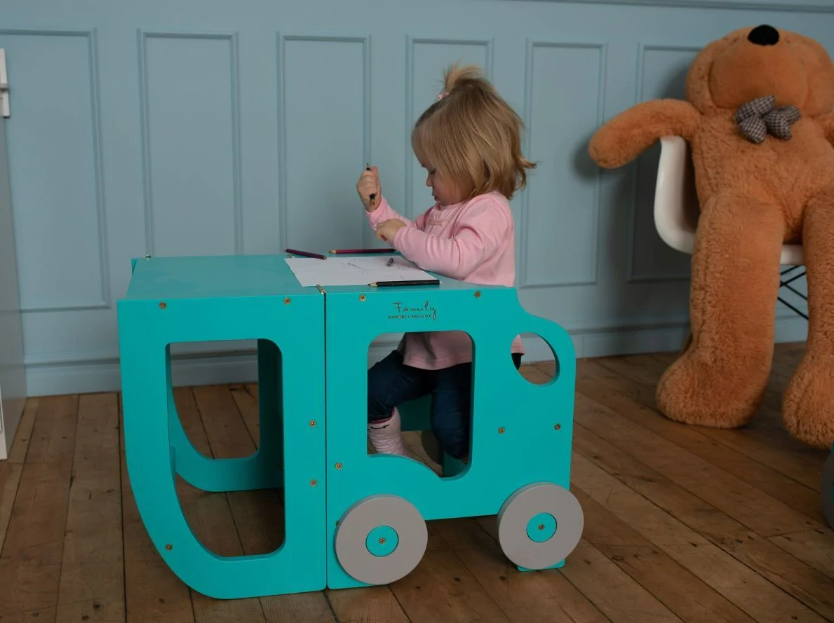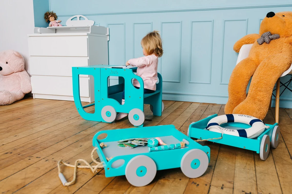 Den tjusiga handgjorda hjälpa till pallen underlättar när barnet ska borsta tänderna, tvätta händerna, assistera föräldrarna vid matlagning eller annan aktivitet dit minstingen inte riktigt når upp. Kan även vikas ihop till ett skrivbord med sittpall när det är dags att ta en paus för färgläggning. Ditt barn kommer att älska att skrivbordet ser ut som en bil!