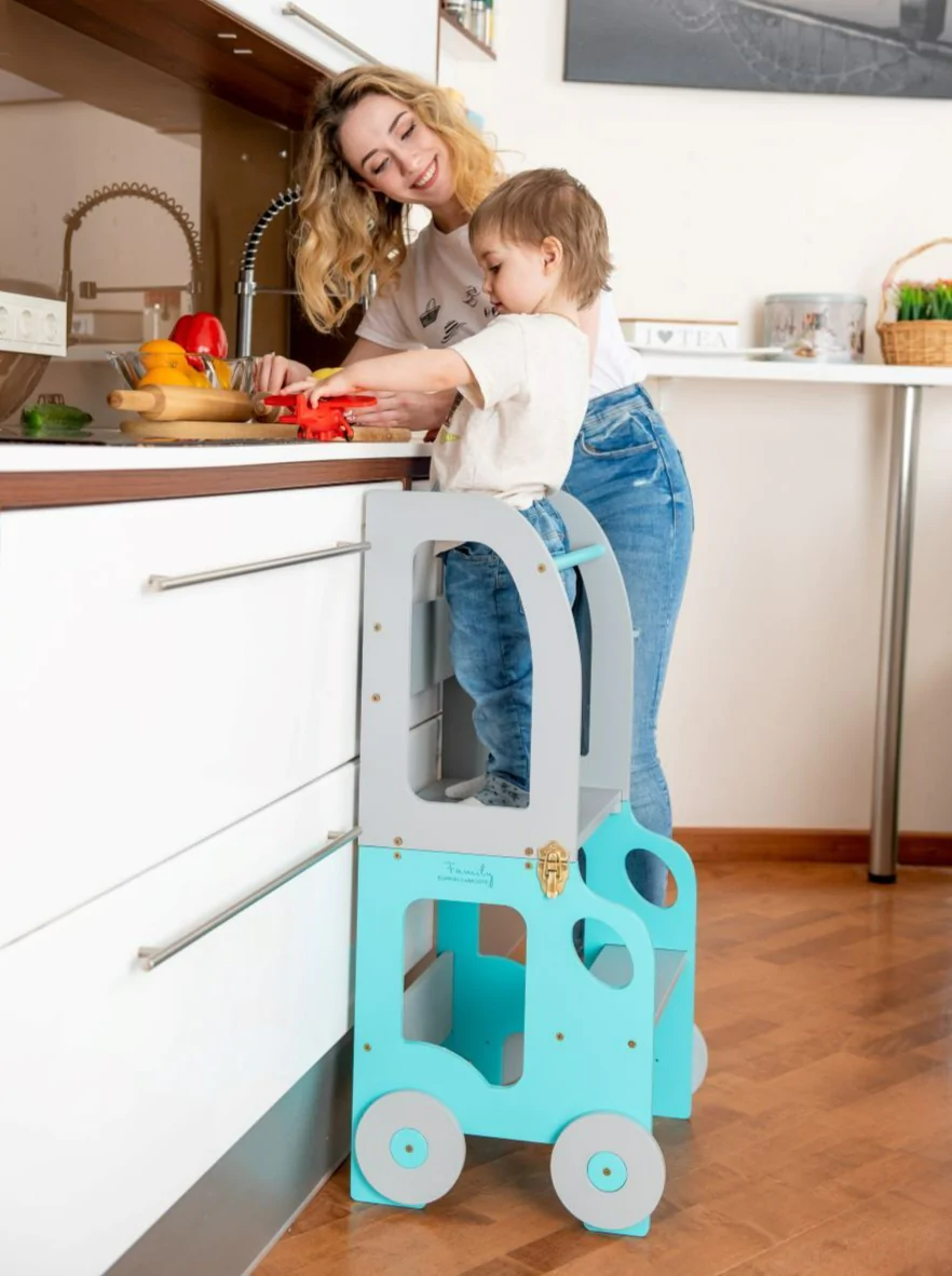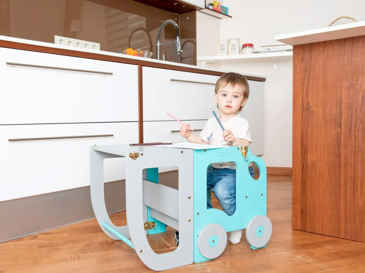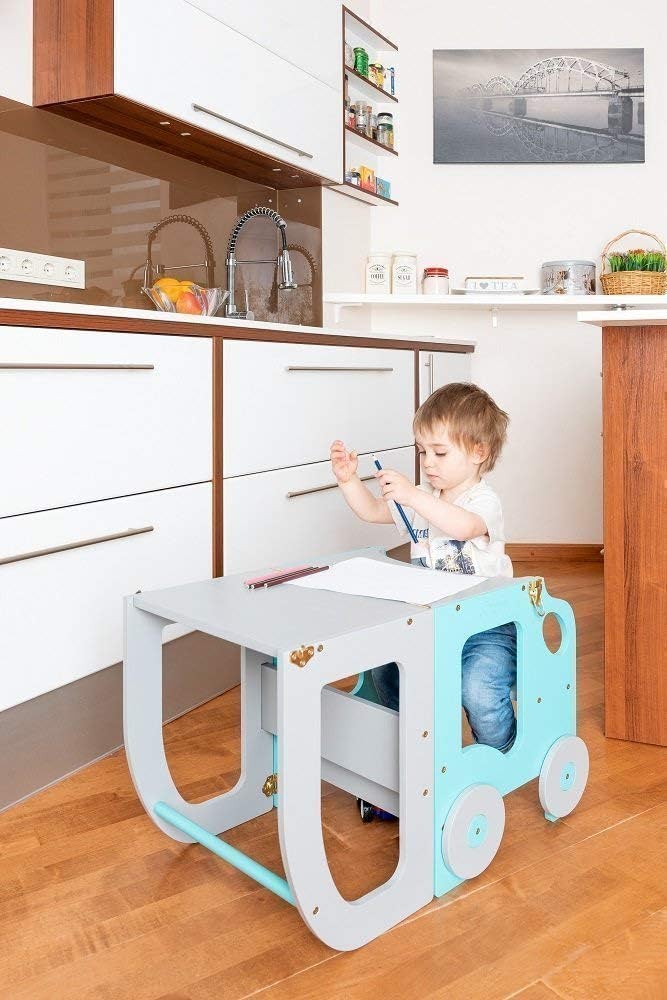 Den tjusiga handgjorda hjälpa till pallen underlättar när barnet ska borsta tänderna, tvätta händerna, assistera föräldrarna vid matlagning eller annan aktivitet dit minstingen inte riktigt når upp. Kan även vikas ihop till ett skrivbord med sittpall när det är dags att ta en paus för färgläggning. Ditt barn kommer att älska att skrivbordet ser ut som en bil!
