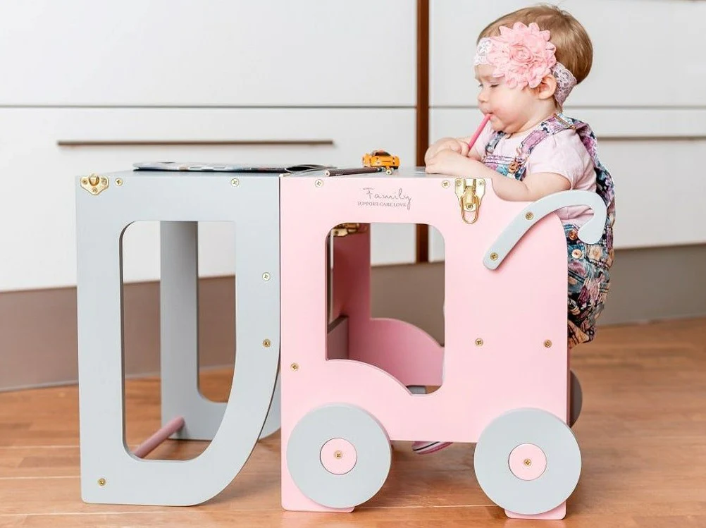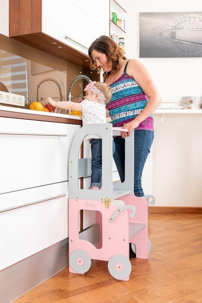 Den tjusiga handgjorda hjälpa till pallen underlättar när barnet ska borsta tänderna, tvätta händerna, assistera föräldrarna vid matlagning eller annan aktivitet dit minstingen inte riktigt når upp. Kan även vikas ihop till ett skrivbord med sittpall när det är dags att ta en paus för färgläggning. Ditt barn kommer att älska att skrivbordet ser ut som en bil!