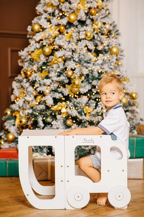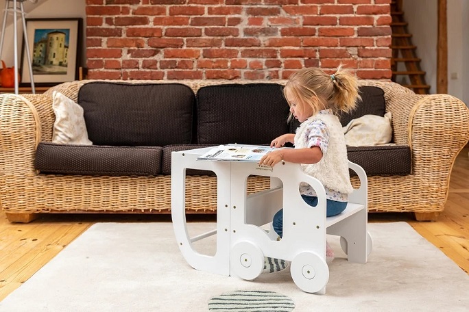 Den tjusiga handgjorda hjälpa till pallen underlättar när barnet ska borsta tänderna, tvätta händerna, assistera föräldrarna vid matlagning eller annan aktivitet dit minstingen inte riktigt når upp. Kan även vikas ihop till ett skrivbord med sittpall när det är dags att ta en paus för färgläggning. Ditt barn kommer att älska att skrivbordet ser ut som en bil!