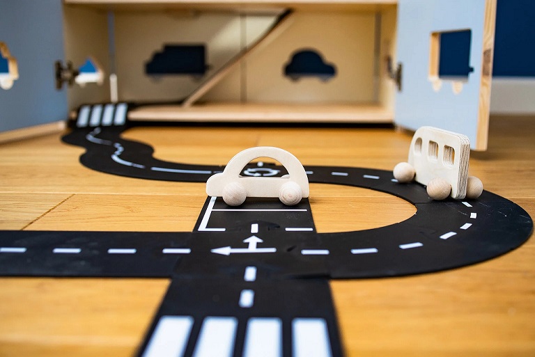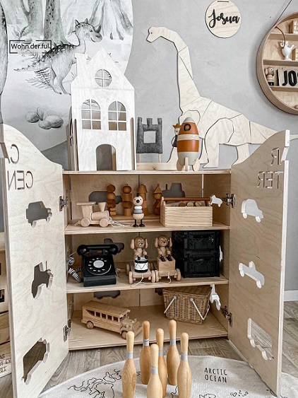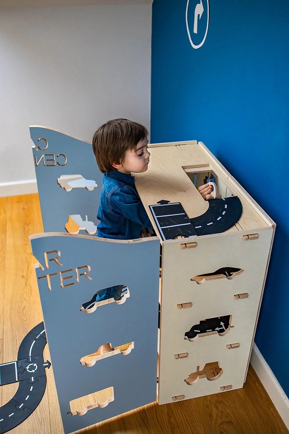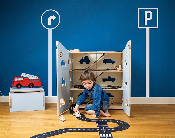 Ett unikt skåp med tre hyllplan som kan användas till garderob, förvaring av leksaker och garage! Ditt barn sätter enkelt ihop den medföljande bilbanan själv, vilket stimulerar och uppmuntrar barnets kreativitet och lek. Skåpets hyllor tas enkelt bort för att omvandla byrån till en avskärmare.