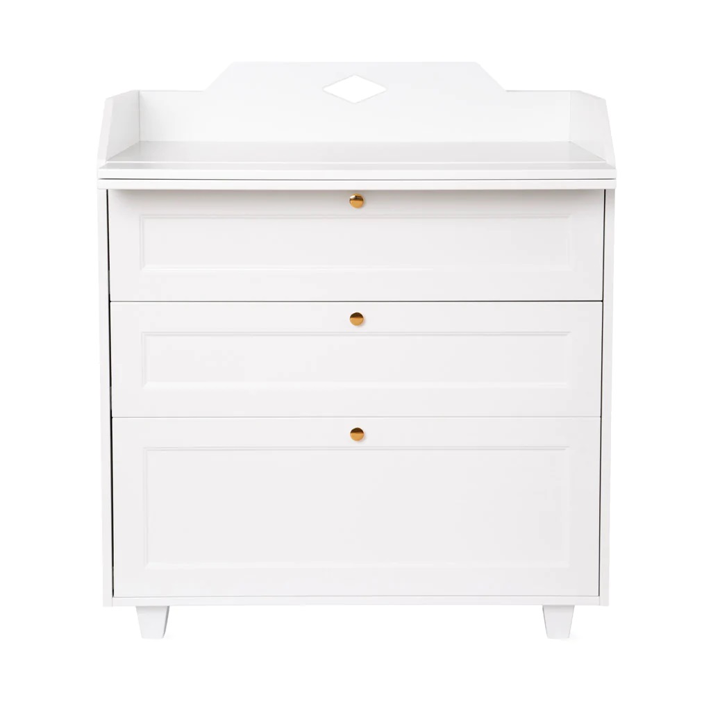En superfin och elegant vit skötbyrå till barnrummet från danska Cam Cam. Byrån har tre praktiska lådor med soft-close-funktion och vackra knoppar i mässing. Omvandlas enkelt till en klassisk byrå när blöjperioden är över.
