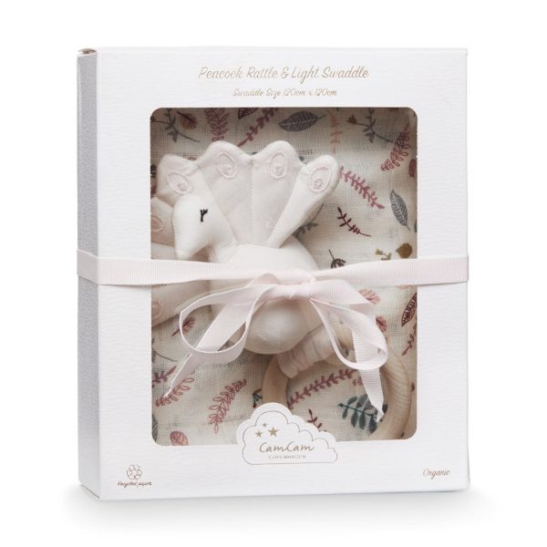 Detta extremt söta lilla gåvoset har allt som du behöver till den nyfödda. I den fina gåvokartongen finner du två underbart mjuka produkter från danska Cam Cam Copenhagen: En snuttefilt och en skallra – båda självklart av organisk bomull. Skallran kommer i form av en underbart vacker påfågel.