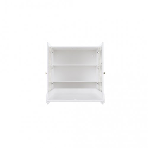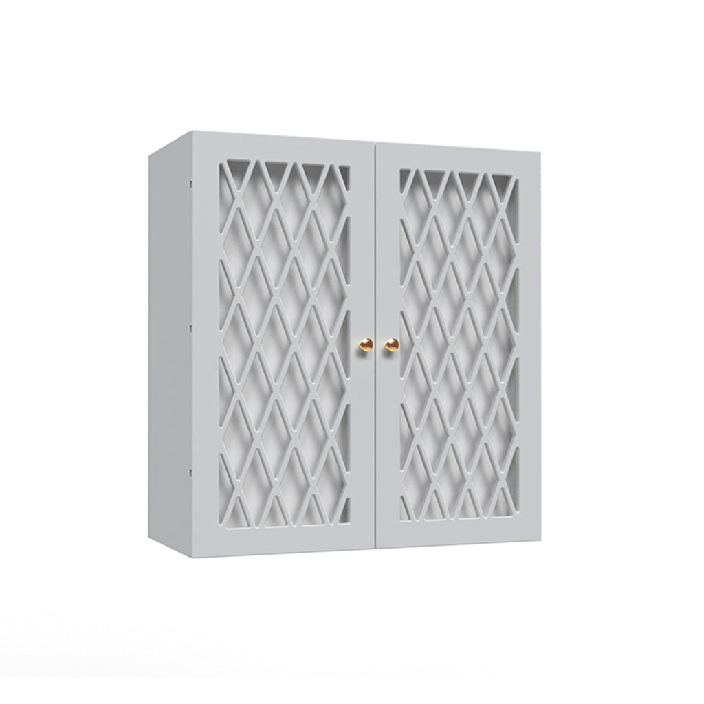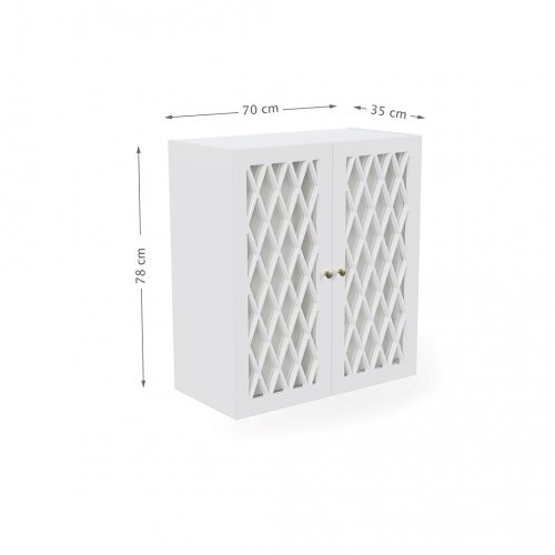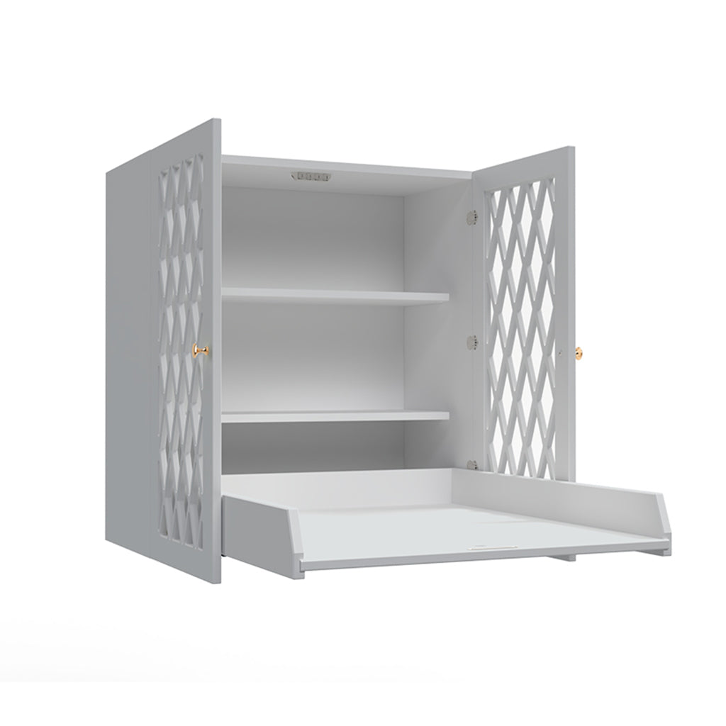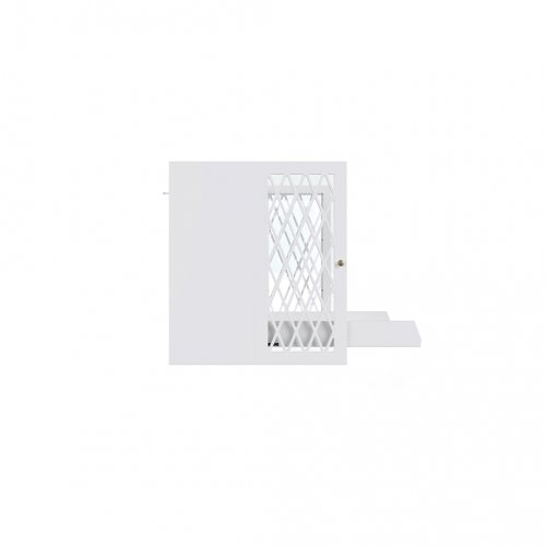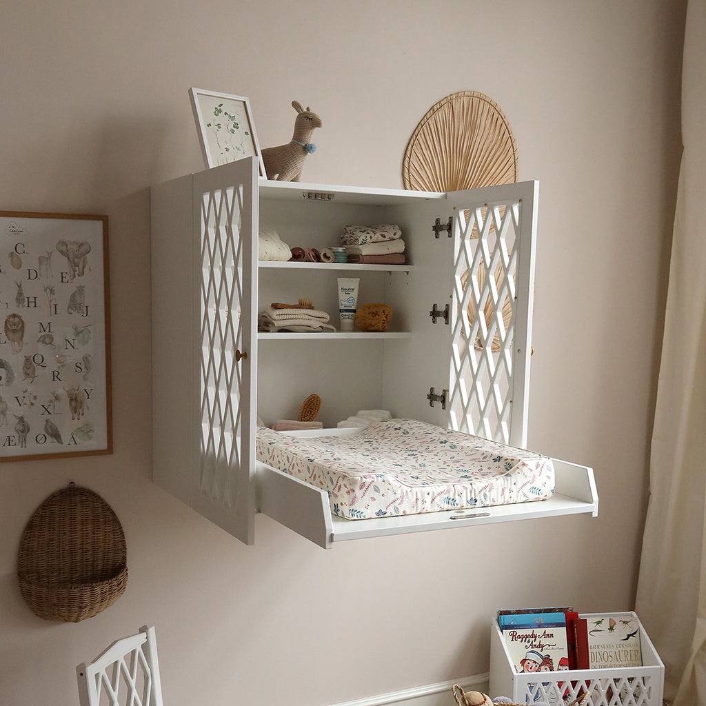 Garderoben har dubbeldörr och praktiska hyllor med plats för blöjor och annat nödvändigt. Anpassad för små utrymmen då skötbrädan fälls ner när den används och fälls upp igen när den inte används. Skötbordet kan senare användas som väggskåp då skötbrädan kan enkelt monteras bort när blöjbytestiden är över.
