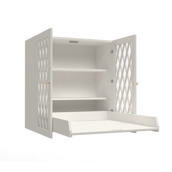 Garderoben har dubbeldörr och praktiska hyllor med plats för blöjor och annat nödvändigt. Anpassad för små utrymmen då skötbrädan fälls ner när den används och fälls upp igen när den inte används. Skötbordet kan senare användas som väggskåp då skötbrädan kan enkelt monteras bort när blöjbytestiden är över.