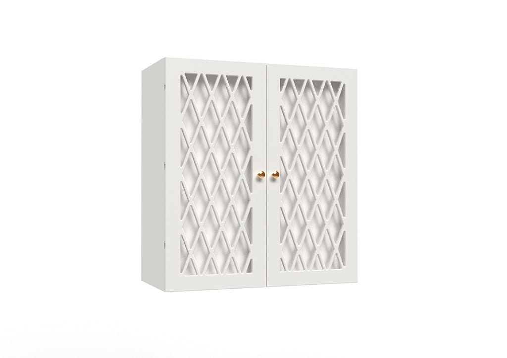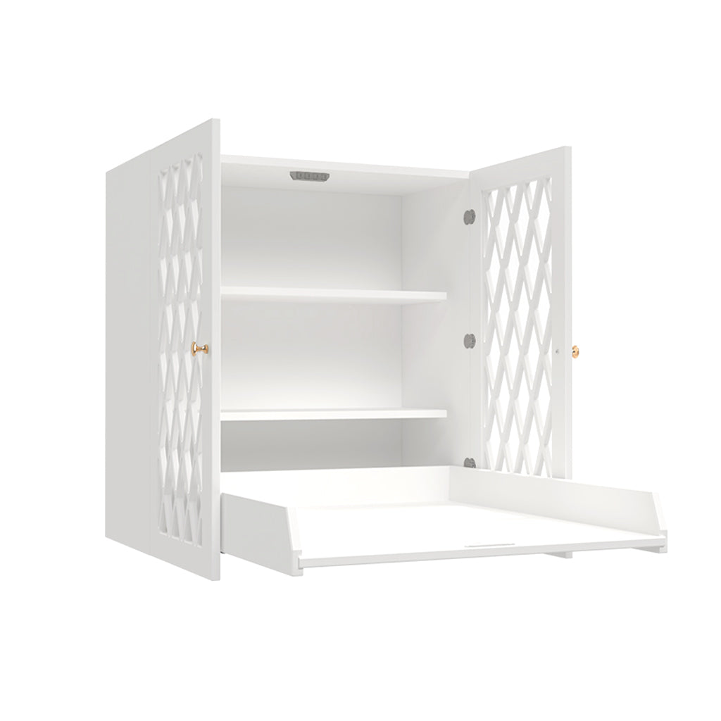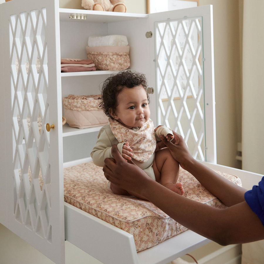 Garderoben har dubbeldörr och praktiska hyllor med plats för blöjor och annat nödvändigt. Anpassad för små utrymmen då skötbrädan fälls ner när den används och fälls upp igen när den inte används. Skötbordet kan senare användas som väggskåp då skötbrädan kan enkelt monteras bort när blöjbytestiden är över.
