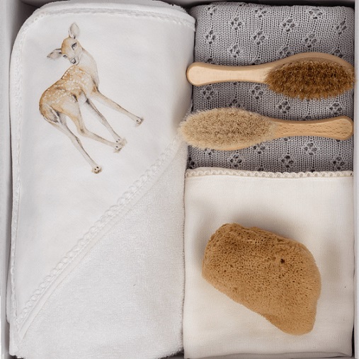 Detta extremt vackra gåvosetet har allt som du behöver till den nyfödda. Presentsetet innehåller en vit premium babyhandduk i bomull, ljusgrå babyfilt i bambu, vanilj snuttefilt med spets i bambu, två borstar och svamp i en vacker premium presentask.
