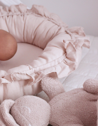 Det bästa av två världar. Cotton & Sweets och babynest av linne med volanger! Detta underbart fina babynest med vackra volanger kommer inte bara vara en säker och mysig plats för ditt lilla barn, utan även förgylla ditt rum med någonting riktigt vackert. Ett babynest är kanske det mest praktiska barntillbehöret som gör att ditt barn kan sova tryggt, var det en befinner sig. Du kan enkelt flytta runt den mellan olika rum, eller ta med dem när ni ska bort eller ut och resa. Barnet sover även tryggare om de ligger i föräldrarnas säng, eller i den egna spjälsängen/vaggan. Matchas självklart med Cotton & Sweets övriga produkter som går i samma stil.