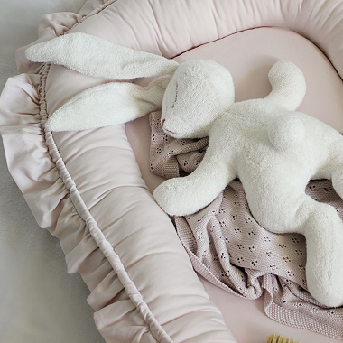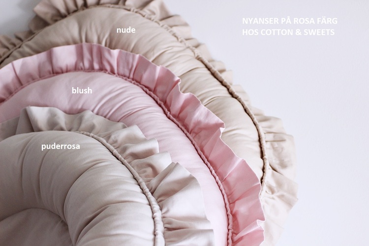 Det bästa av två världar. Cotton & Sweets och babynest med volanger! Detta underbart fina babynest med vackra volanger kommer inte bara vara en säker och mysig plats för ditt lilla barn, utan även förgylla ditt rum med någonting riktigt vackert. Ett babynest är kanske det mest praktiska barntillbehöret som gör att ditt barn kan sova tryggt, var det en befinner sig. Du kan enkelt flytta runt den mellan olika rum, eller ta med dem när ni ska bort eller ut och resa. Barnet sover även tryggare om de ligger i föräldrarnas säng, eller i den egna spjälsängen/vaggan. Matchas självklart med Cotton & Sweets övriga produkter som går i samma stil.