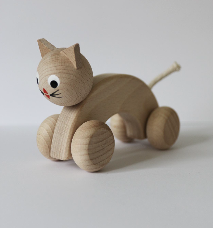 En underbart fin och fantastisk träleksak från Ella & Frederik, i formen av ett katt som följer med när barnet drar den över golvet.