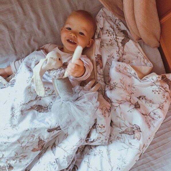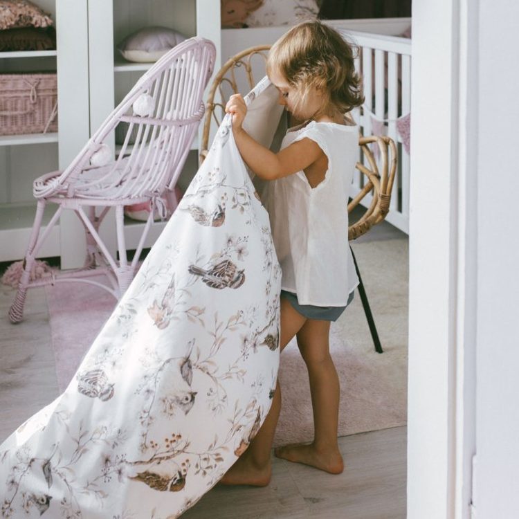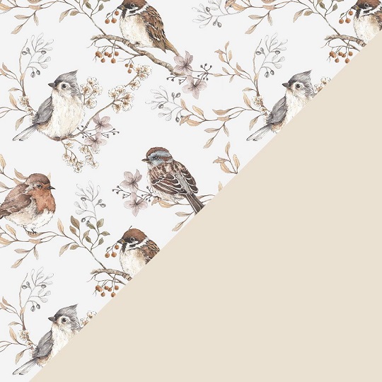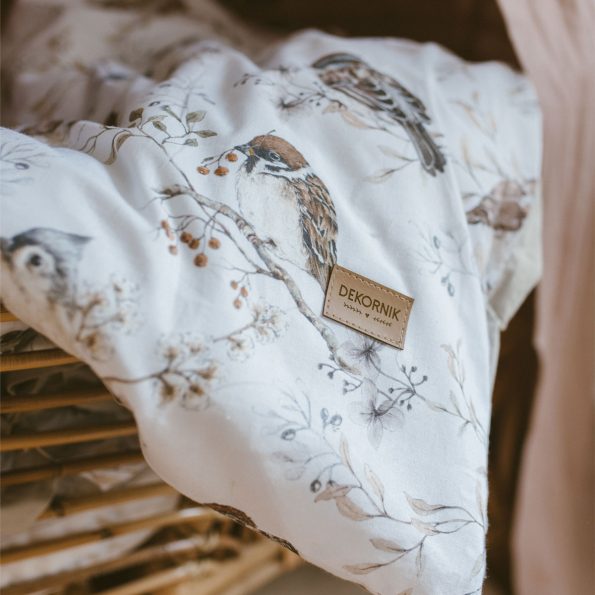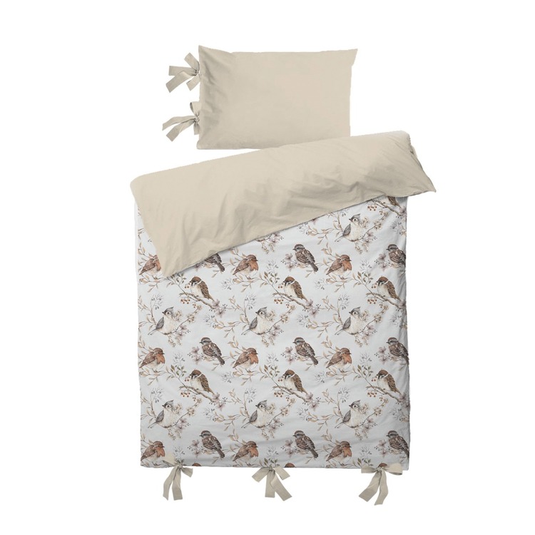 Överraskande vackra barnsängkläder av bomullssatin ger det bästa till ditt barn. Med vackra fåglar på ena sidan och beige färg på andra sidan kommer det även att passa väl in i din barnrumsinredning.
