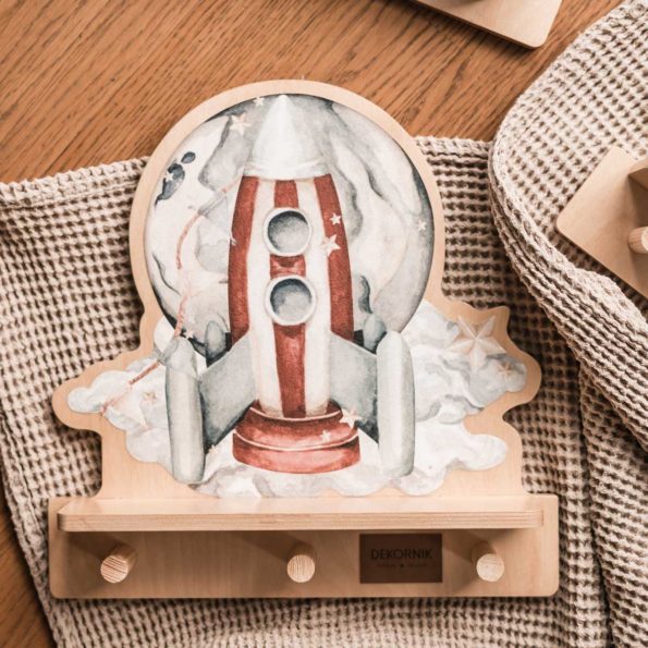 En superfin och söt hylla gjord av utvald plywood och med formen av en fin rymdraket. Tillverkad av det hos oss mycket populära företaget Dekornik.