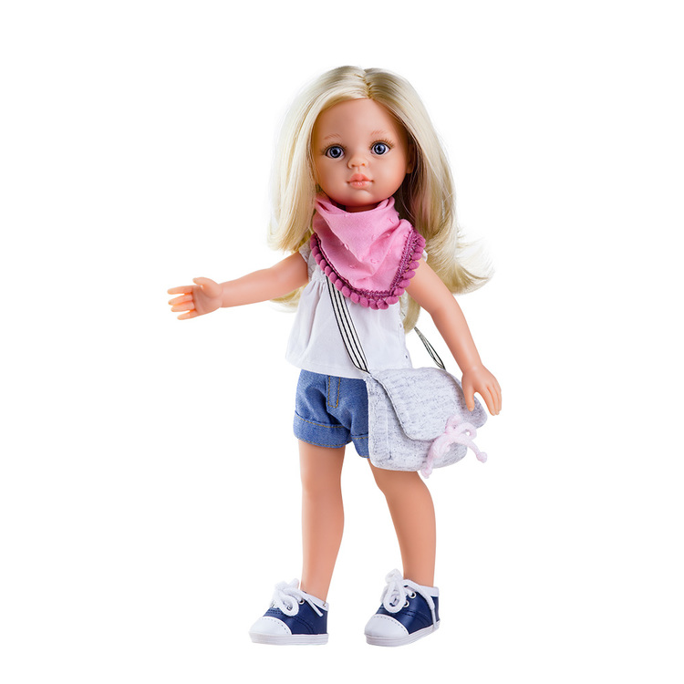 Blonda Claudia kommer att bli ditt barns bästa vän. Vackert klädd i shorts, vit t-shirt , fina sportskor, väska och rosa tubhalsduk.