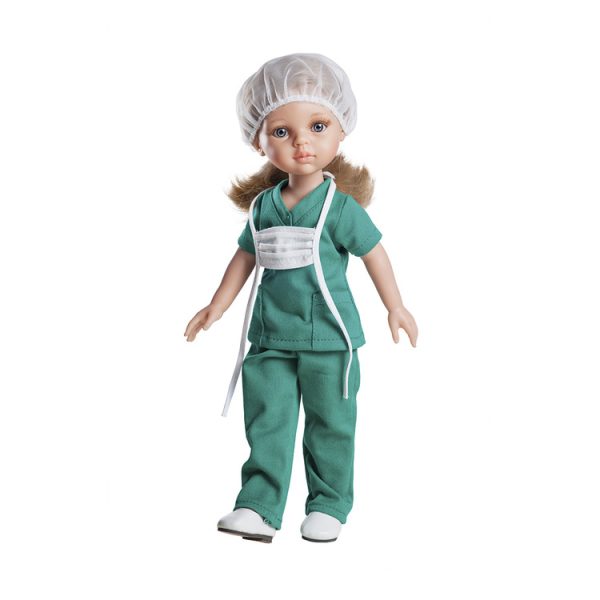 Blonda Carla kommer att bli ditt barns bästa vän. Vackert klädd i grön uniform, kirurgisk mask, mössa och vita skor.