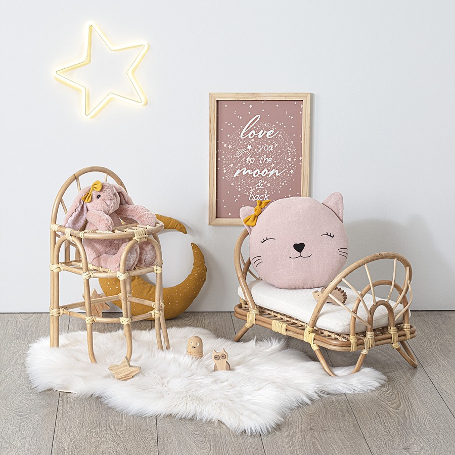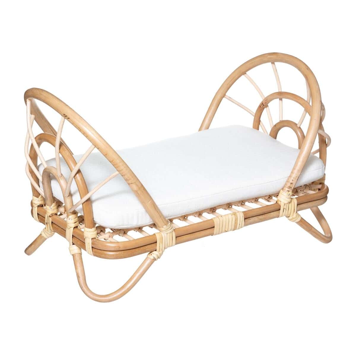 Vi saknar ord för denna snygga docksäng i rotting! Oerhört detaljrik möbel i vintagestil som kommer bidra mycket till en harmonisk barnrumsinredning.Madrassöverdraget är avtagbart och går att tvätta i maskin. Docksängen rengör du enkelt med en fuktad trasa. Matcha gärna med våra andra produkter i rotting. Mått: 55 x 30 x 34cm Material: Rotting