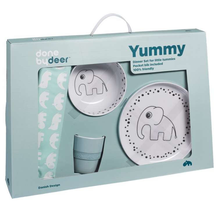 I en fantastiskt fin presentförpackning kommer dessa fina matillbehör. Lyckliga prickar dansar runt elefanten Elphee på tallriken och hon tittar även upp från botten av den fina muggen. Haklappen fångar upp all mat som missar munnen. Setet inkluderar: Dots Yummy Plate Ø20,5 cm, Dots Yummy Bowl Ø13,5×5 cm & en Yummy Mug Ø7,5×8,5 cm. Dessa produkter kan tvättas i diskmaskin men…