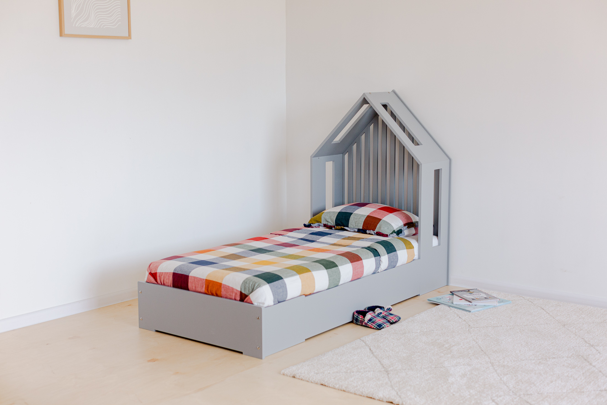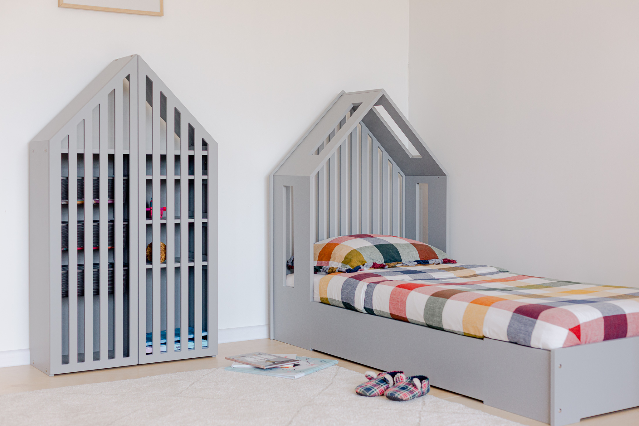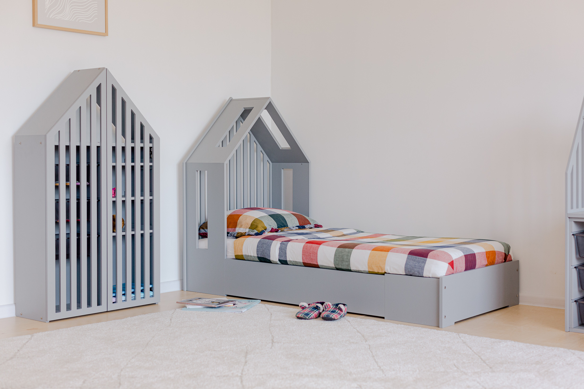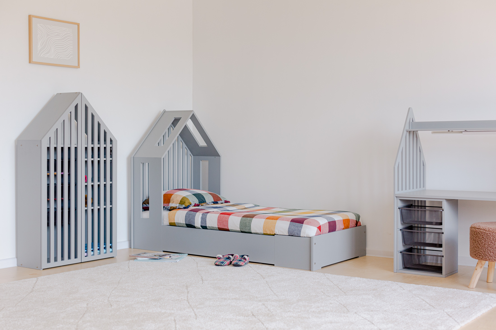 Skapa en rogivande sovmiljö med vår nya barnsäng. Sängen har en unik och charmig design med husinspirerade linjer och erbjuder en trygg och bekväm sovplats för ditt barn.
