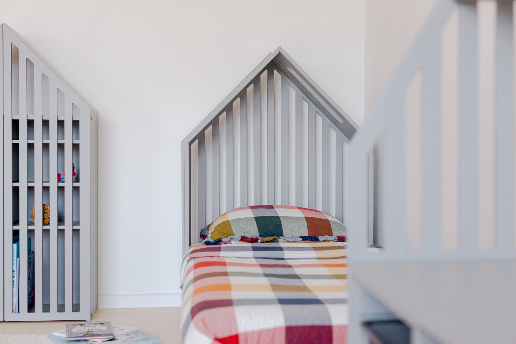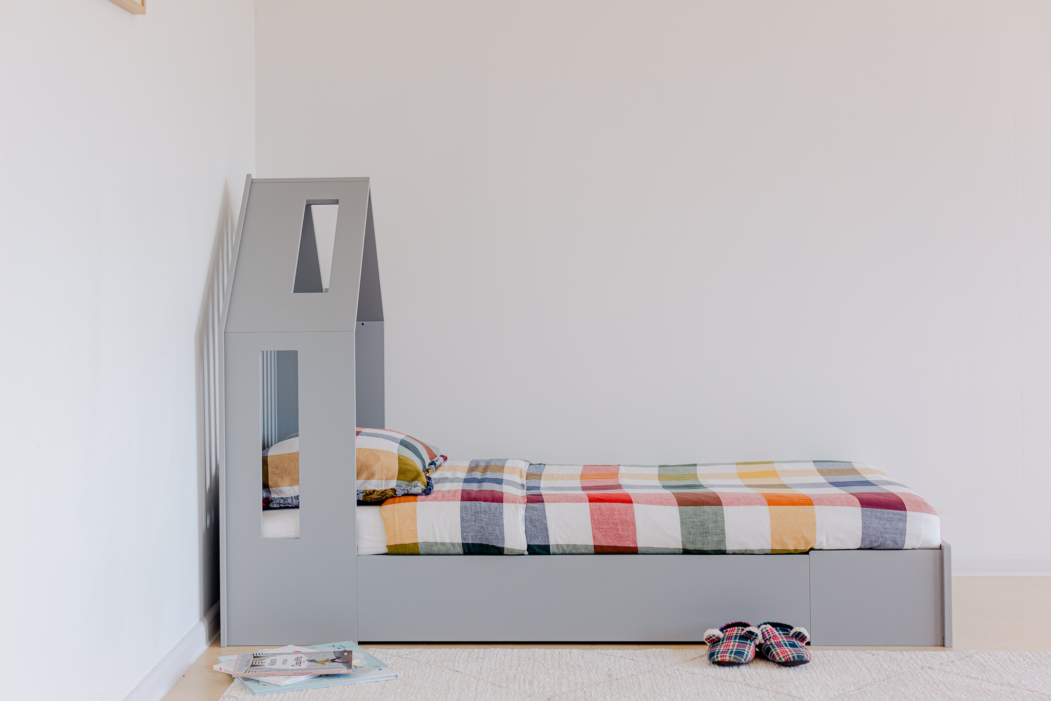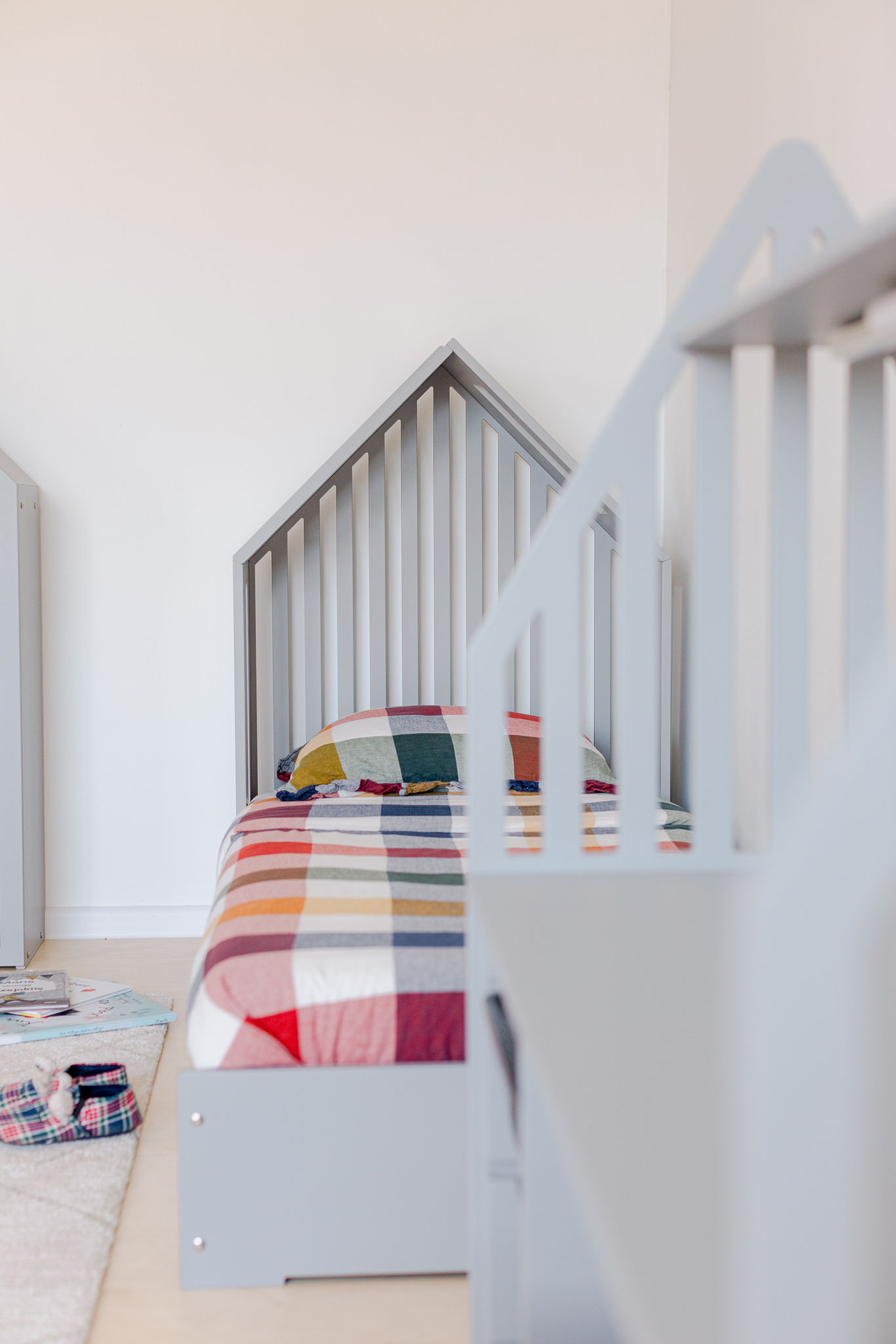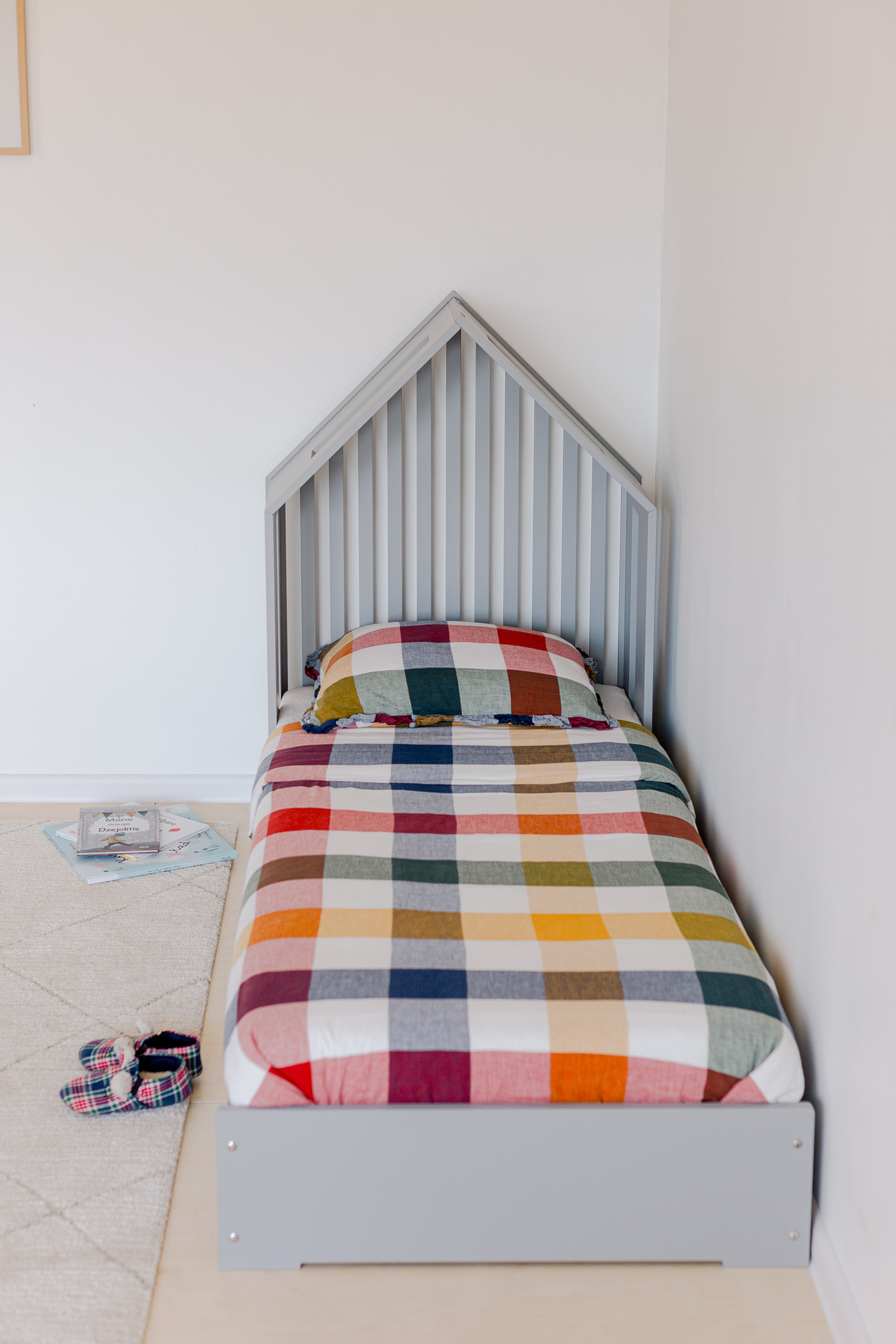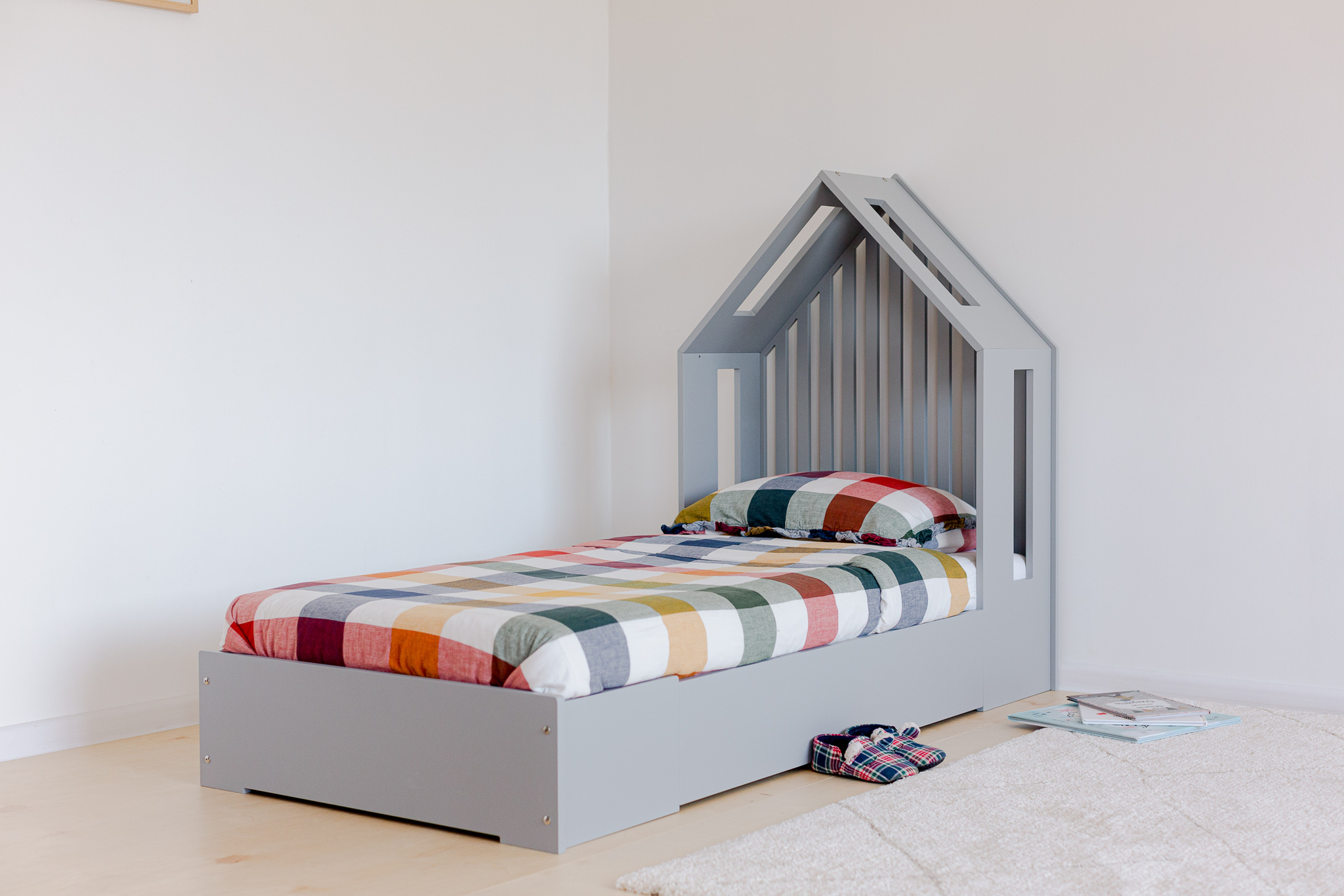 Skapa en rogivande sovmiljö med vår nya barnsäng. Sängen har en unik och charmig design med husinspirerade linjer och erbjuder en trygg och bekväm sovplats för ditt barn.