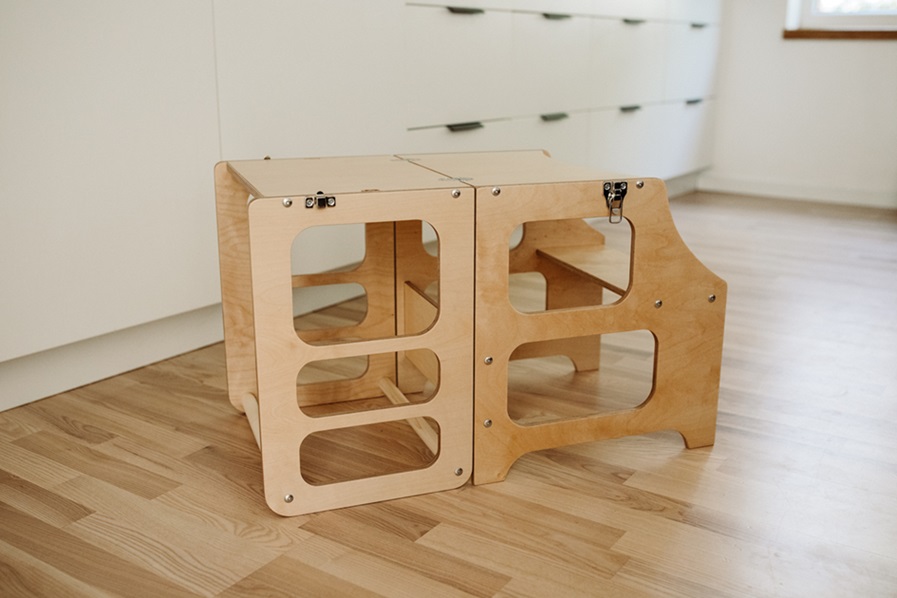 Smart och snygg 3 i 1-produkt från populära Duck Woodworks! Den tjusiga hjälpa till pallen underlättar när barnet ska borsta tänderna, tvätta händerna, assistera föräldrarna vid matlagning eller annan aktivitet dit minstingen inte riktigt når upp. Kan även vikas ihop till ett skrivbord med pall när det är dags att ta en paus för färgläggning. Rutschkanan som enkelt fästs på skrivbordet…