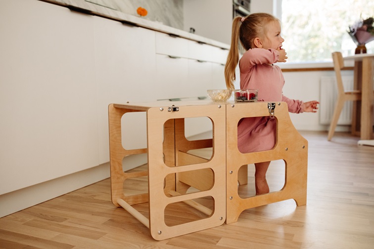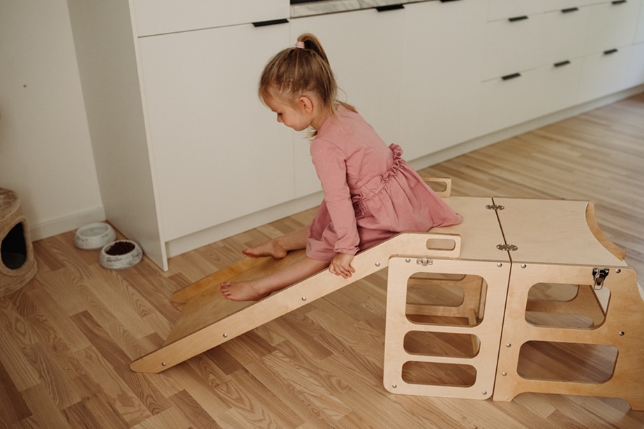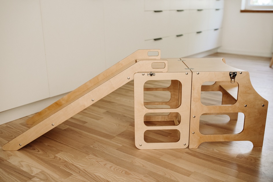 Den tjusiga hjälpa till pallen underlättar när barnet ska borsta tänderna, tvätta händerna, assistera föräldrarna vid matlagning eller annan aktivitet dit minstingen inte riktigt når upp. Kan även vikas ihop till ett skrivbord med pall när det är dags att ta en paus för färgläggning. Rutschkanan som enkelt fästs på skrivbordet kommer att erbjuda många timmar av lek.