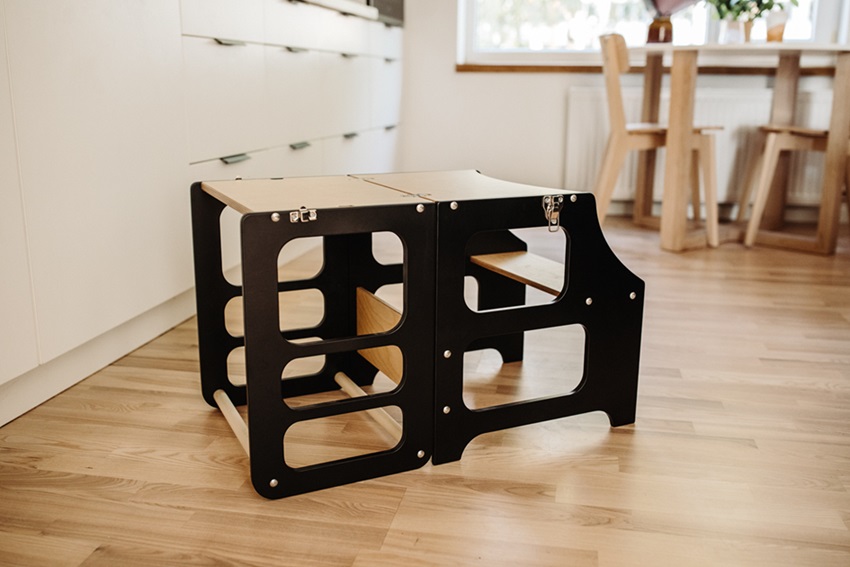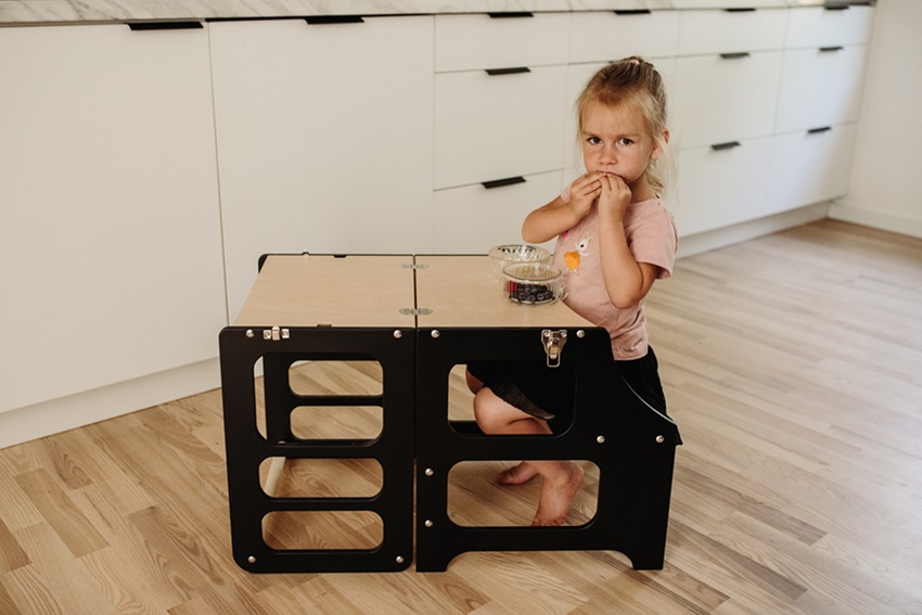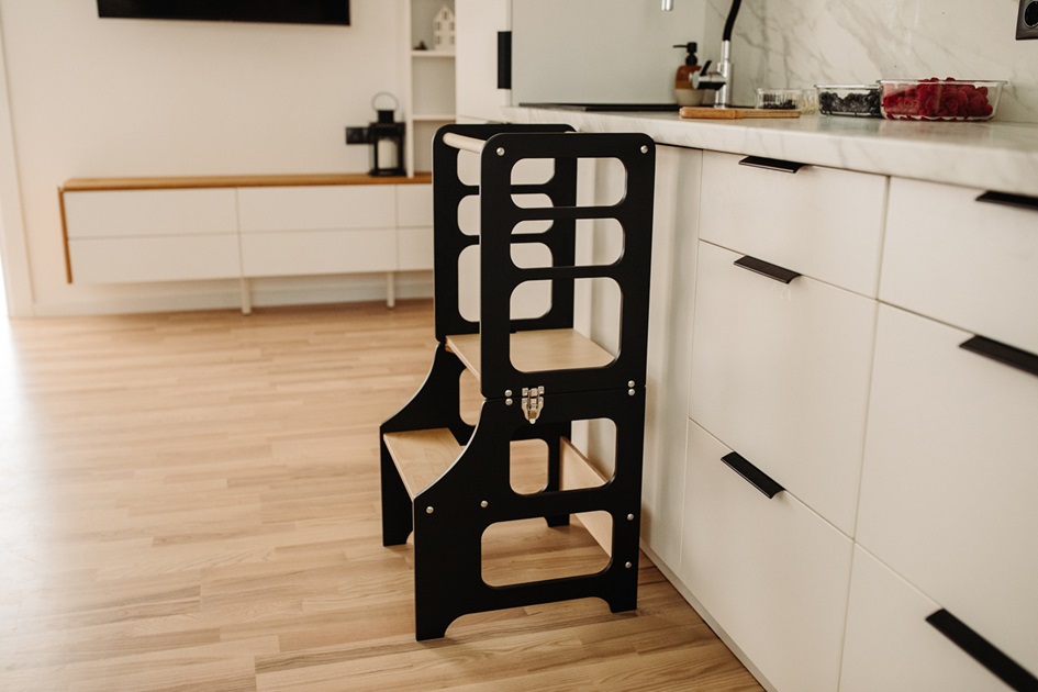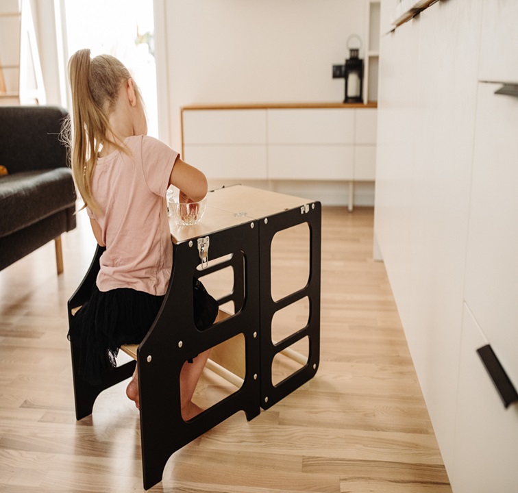 Den tjusiga hjälpa till pallen underlättar när barnet ska borsta tänderna, tvätta händerna, assistera föräldrarna vid matlagning eller annan aktivitet dit minstingen inte riktigt når upp. Kan även vikas ihop till ett skrivbord med pall när det är dags att ta en paus för färgläggning.