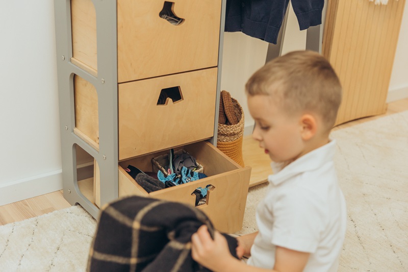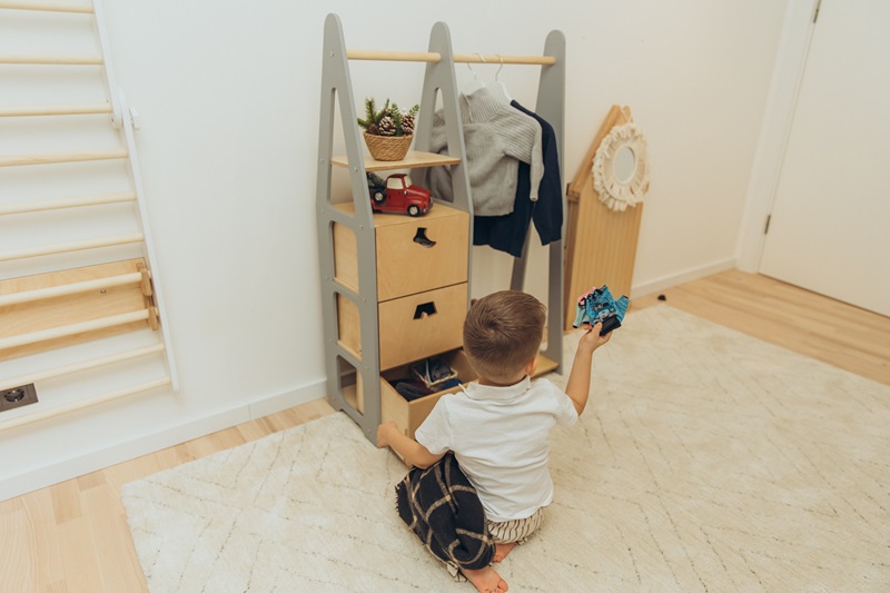 Garderoben består av en klädstång, tre stora lådor och en bottenhylla. Barnet kommer att få en känsla av att kliva in i sitt klädhus och själv välja ut dagens outfit eller varför inte använda garderoben som förvaring av ditt barns favoritleksaker?