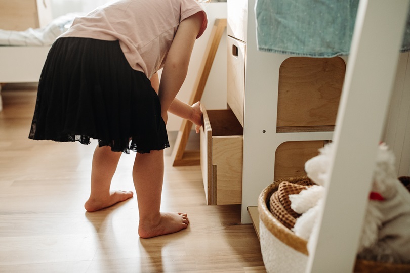Garderoben består av en klädstång, tre stora lådor och en bottenhylla. Barnet kommer att få en känsla av att kliva in i sitt klädhus och själv välja ut dagens outfit eller varför inte använda garderoben som förvaring av ditt barns favoritleksaker?