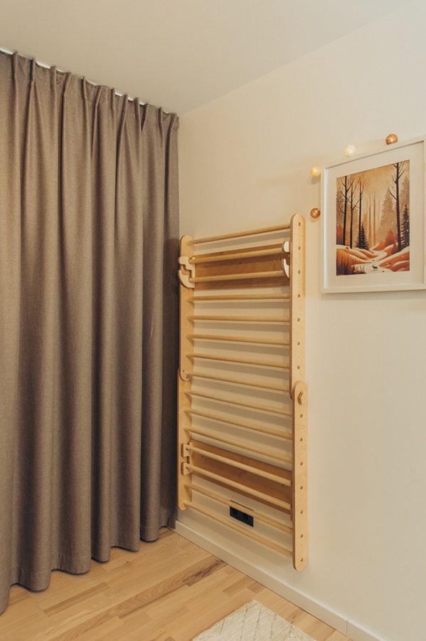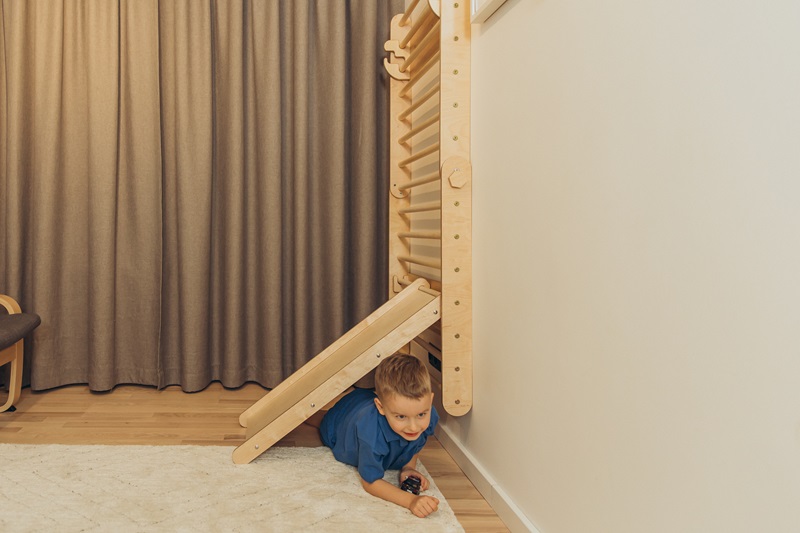 Kan användas som både klättertriangel eller väggmonterad ribbstol med rutschkana. Den medföljande pull up-stången möjliggör ännu större utbud av övningar än de traditionella ribbstolarna.