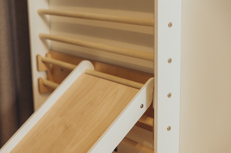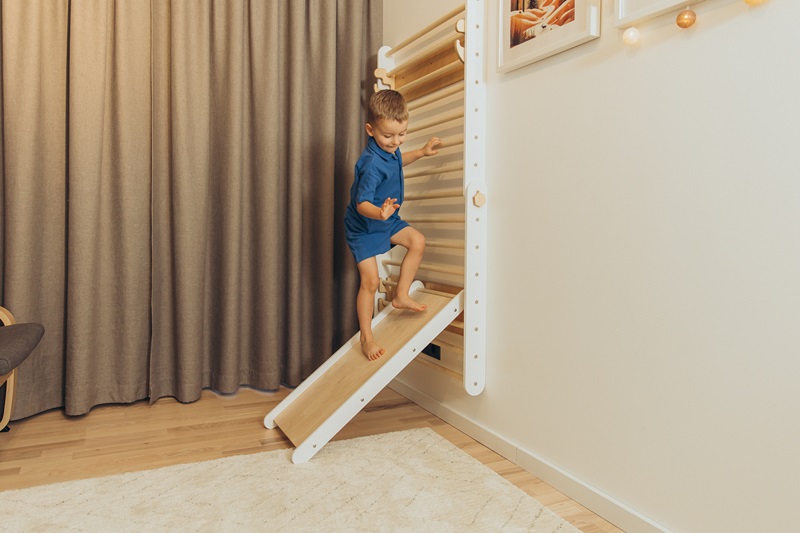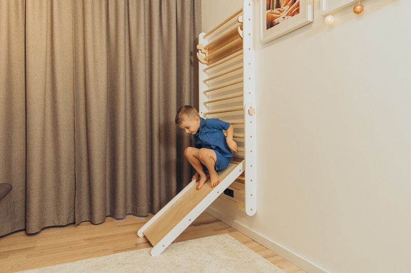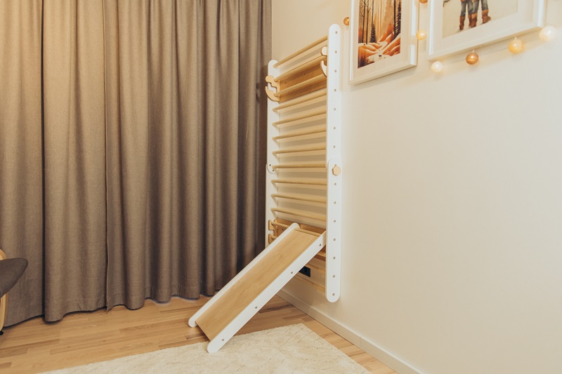 Kan användas som både klättertriangel eller väggmonterad ribbstol med rutschkana. Den medföljande pull up-stången möjliggör ännu större utbud av övningar än de traditionella ribbstolarna.