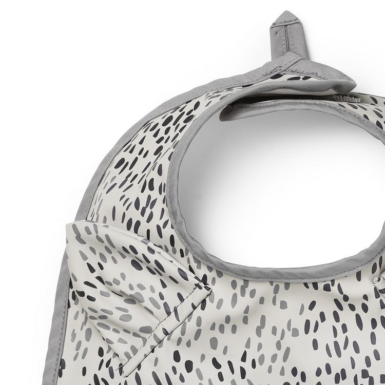 Haklappen täcker såväl axlarna som bröstet och fickan framtill fångar upp allt spill och alla smulor. Du fäster enkelt haklappen i nacken på ditt barn och det är på kort tid redo för sin måltid.