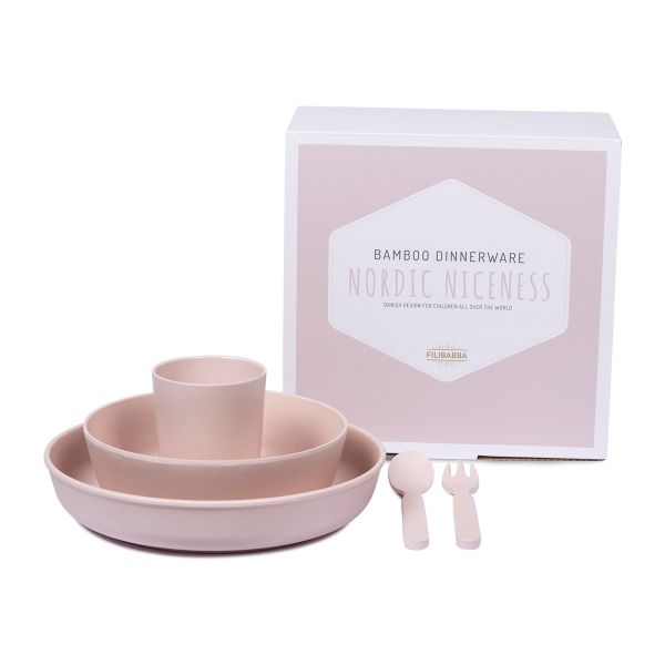 Ett stilrent och fint matset från danska Filibaba innehållande en tallrik med höga kanter, en fin mugg, en djup skål och självklart sked och gaffel. Ditt barn kommer att ah mycket glädje av dessa, och likaså du. Hela matsetet är gjort av en ekologisk, nedbrytbar bambu och är en perfekt gåva på ett dop eller en födelsedag (Kommer i en vacker förpackning).