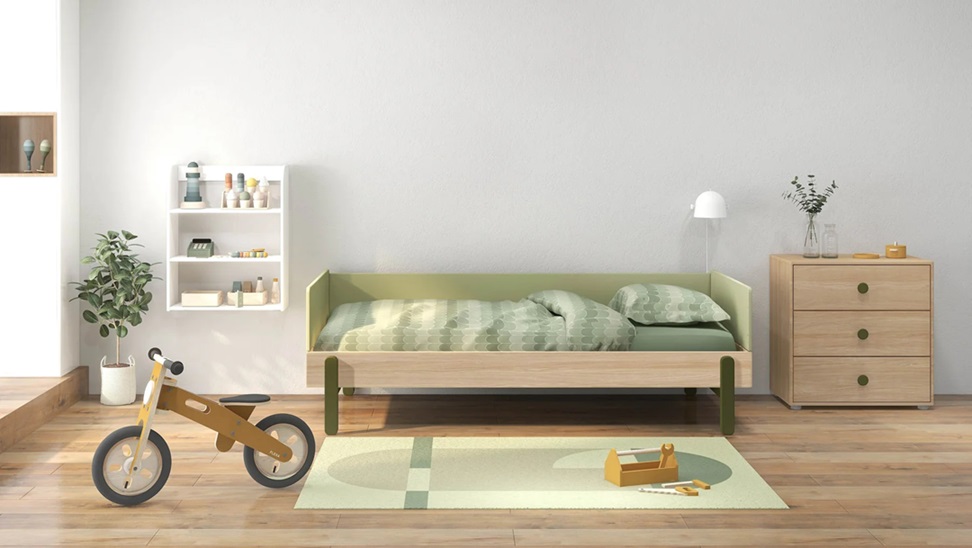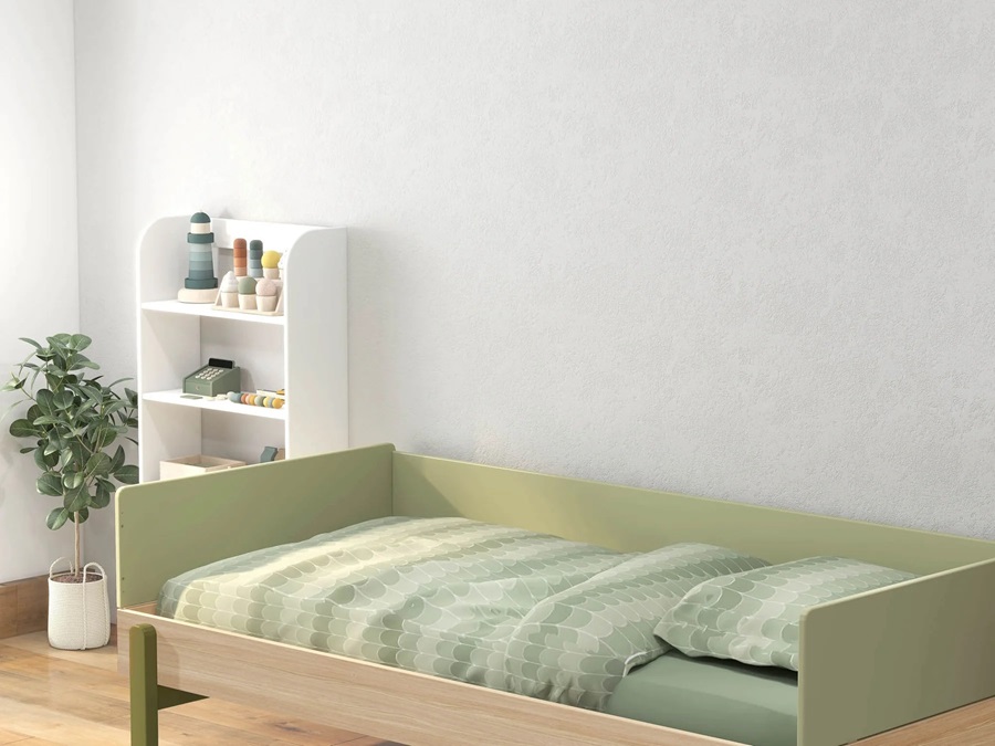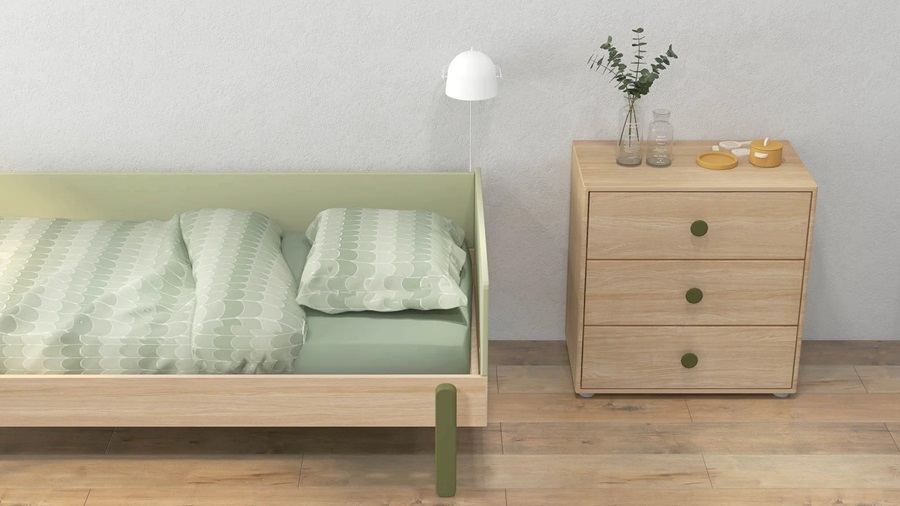 Kan användas som säng på natten och som soffa på dagen. Sängen kan köpas med en smart stödbräda som skyddar barnet från att rulla ur sängen och 2 förvaringslådor på hjul som är perfekta att förvara leksaker eller sängkläder.