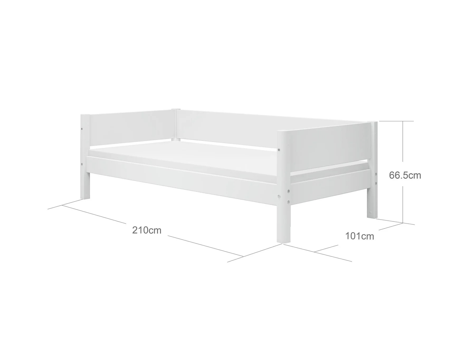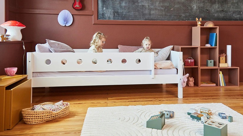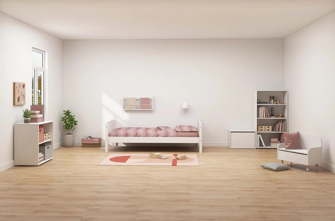 Kan användas som säng på natten och som soffa på dagen. Sängen kan köpas med en smart stödbräda som skyddar barnet från att rulla ur sängen och 2 förvaringslådor på hjul som är perfekta att förvara leksaker eller sängkläder.