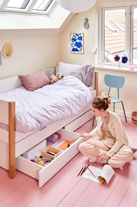 Kan användas som säng på natten och som soffa på dagen. En underbart fin och praktisk säng med förvaringslådor och extrabädd. Perfekt för syskonen i ett litet rum, eller för ditt barns vänner när de ska sova över.