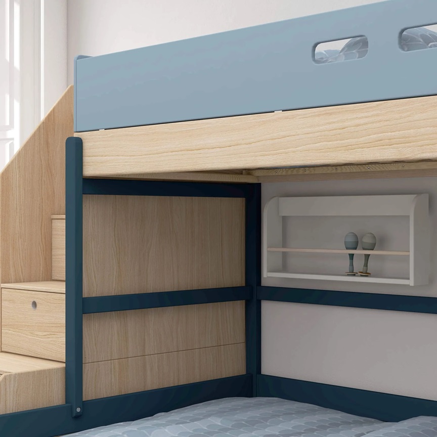 Trappan har en unik inbyggd förvaring. Perfekta att förvara leksaker eller sängkläder. Om mer förvaring önskas kan förvaringslådor köpas till syskonsängen.