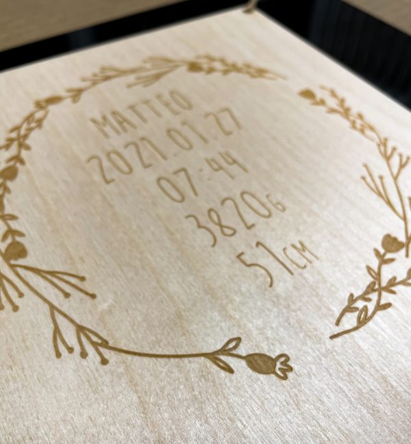 En fin och personlig födelsevimpel av trä. Passar perfekt som en dekoration i barnrummet eller som doppresent.