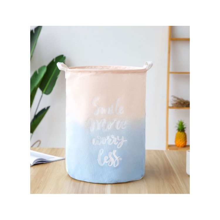 Söt och praktisk liten förvaringskorg som kommer hjälpa dig att hålla ordning samtidigt som du skapar en vacker barnrumsinredning. Motiverande text på framsidan ” Smile more, worry less”.