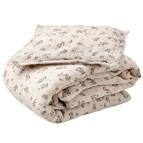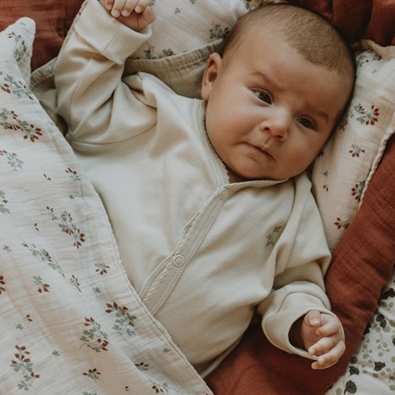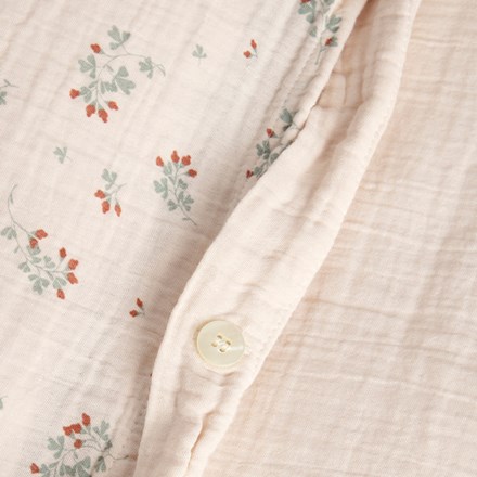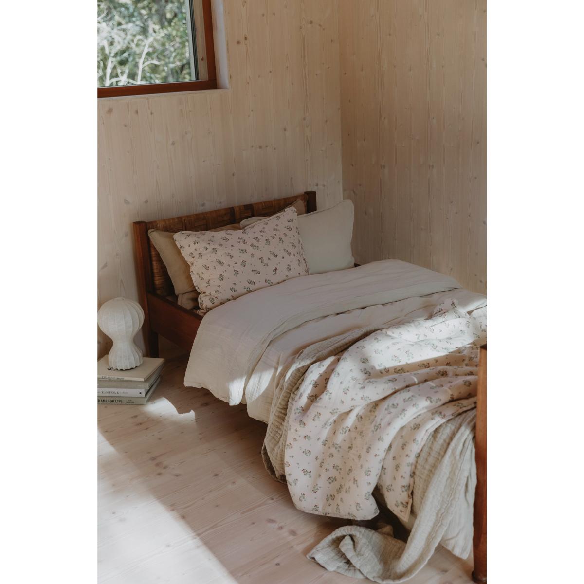 Gjord av organisk bomullsmuslin vilket garanterar en bra sömn för de minsta från första kvällen. Tyget blir bara mjukare för varje tvätt. Bäddsetet har en stilren knappstängning.
