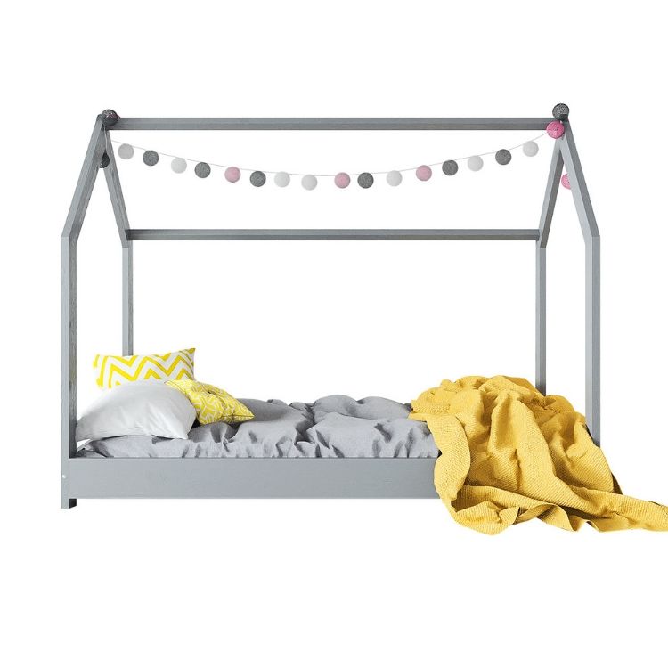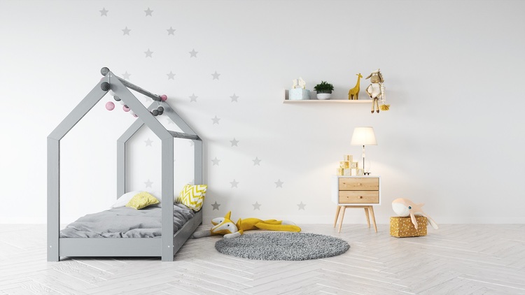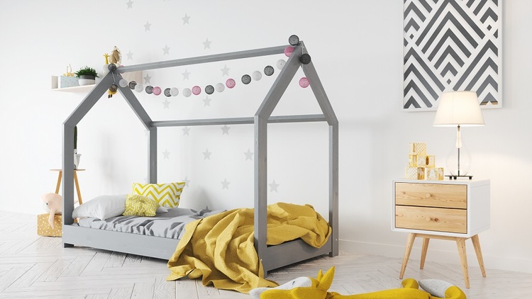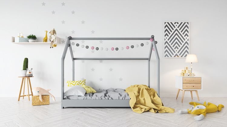 En stilren grå hussäng till barnrummet som även fungerar att använda som en koja, och när det är dags att sova är det den ultimata sovplatsen för ditt barn.