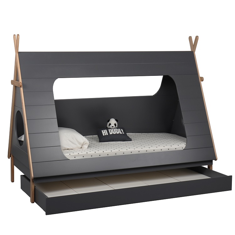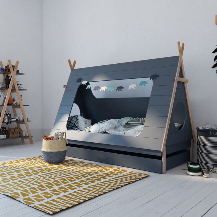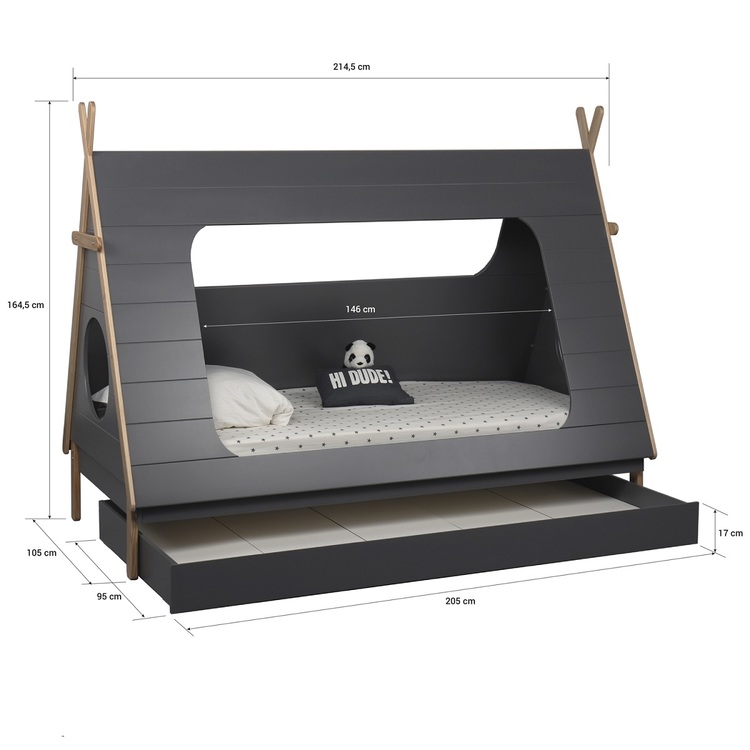En unik grå/blå tipisäng till barnrummet som även fungerar att använda som en koja, och när det är dags att sova är det den ultimata sovplatsen för ditt barn.