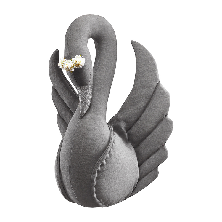 En underbar väggdekoration i from av en svan, som är fantastisk mjuk och mysig, då den är helt gjord av linne. Förutom mysighetsfaktorn, kommer den även att bli en mycket fin detalj i barnrummet, och du placerar den där den får en framskjuten plats. Svanen är förberedd för att hänga på väggen, då den har hängare fastsydda, och du kan hänga den på en krok som du limmar på väggen (då den inte väger så mycket). Hur enkelt och fint som helst.
