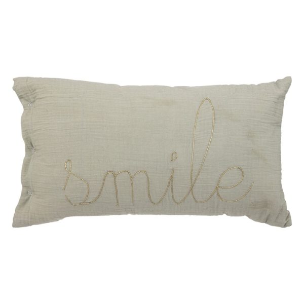 En fantastisk kudde med inbroderad text ”smile”!Det vackra utförandet är en sak, men de underbar materialvalen gör det även till en kramfavorit hos barnen. Om du bara ska köpa en inredningsprodukt till barnrummet, är denna den du ska köpa! Kudden kommer komplett med överdrag och fyllning.Mått: 50 x 30 cmMaterial: Bomull och polyester