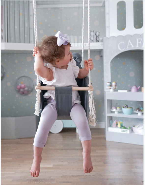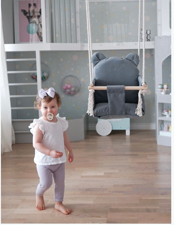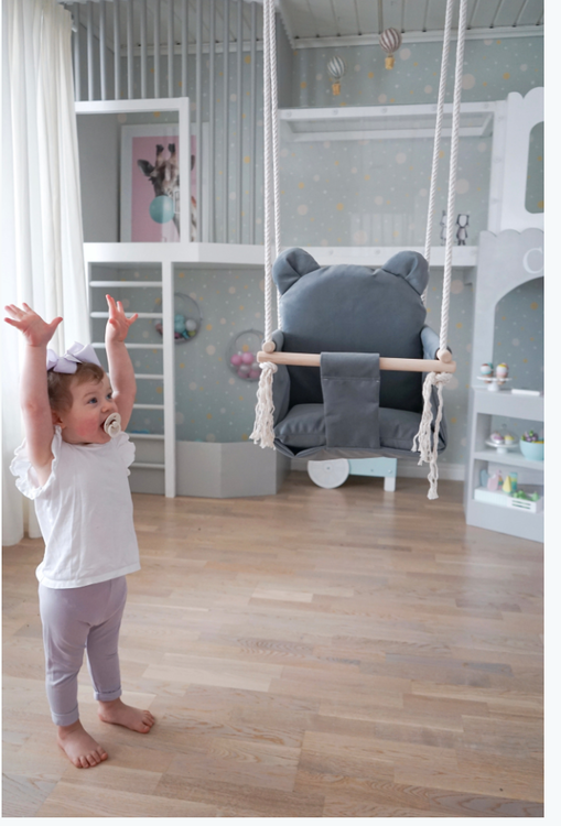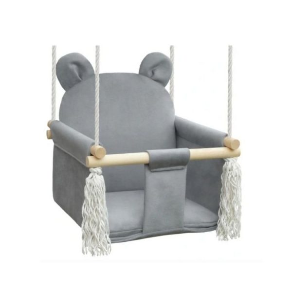 Gjord av tjockt tyg, med en vadderad mjuk madrass i form av en söt björn. Gungan är gjord i rejält material och i naturliga färger, så den är vacker men samtidigt bastant.