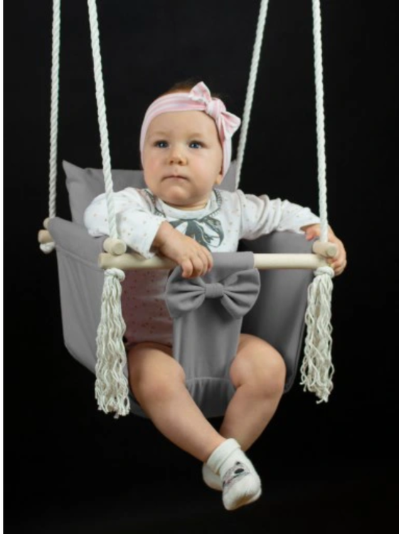 Gjord av tjockt tyg, med en vadderad mjuk madrass i form av en söt björn. Gungan är gjord i rejält material och i naturliga färger, så den är vacker men samtidigt bastant.