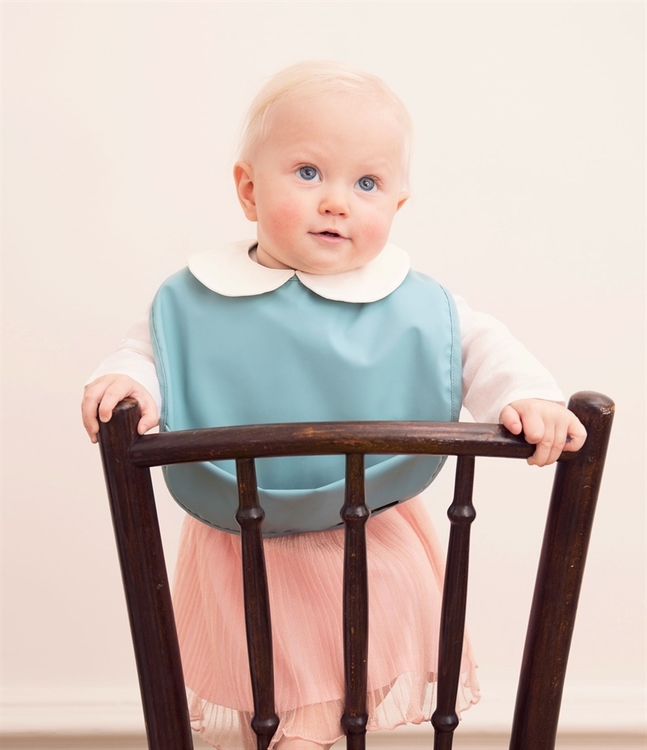 Haklappen täcker såväl axlarna som bröstet och fickan framtill fångar upp allt spill och alla smulor. Du fäster enkelt haklappen i nacken på ditt barn och det är på kort tid redo för sin måltid.