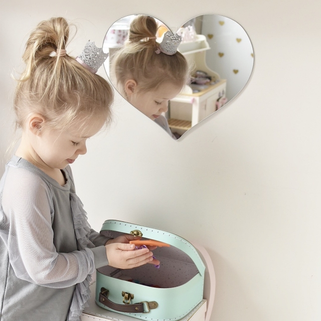 Superfin spegel i form av en hjärta gjord i tålig akryl . En fantastisk dekoration till barnrummet och en fin inredningsdetalj som du kommer att älska. Enkel att hänga upp på väggen med hjälp av metallkroken som medföljer.Denna lättviktsspegel är såväl smidig som säker i barnrummet. Mått: 33,5 cm x 26 cm. Material: 100 % AkrylTillverkad i EU.