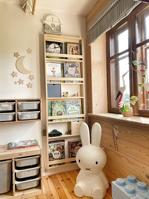 Du väljer själv om du önskar ha bokhyllan och lådorna i natur eller i andra färger. På det sättet kan du anpassa vägghyllan helt efter inredningen i just ditt barnrum. Lådorna har öppningar, men man kan även själv montera knoppar på dem om man så önskar. De kan givetvis även användas separat som fina förvaringsboxar, en mycket flexibel och fin konstruktion.