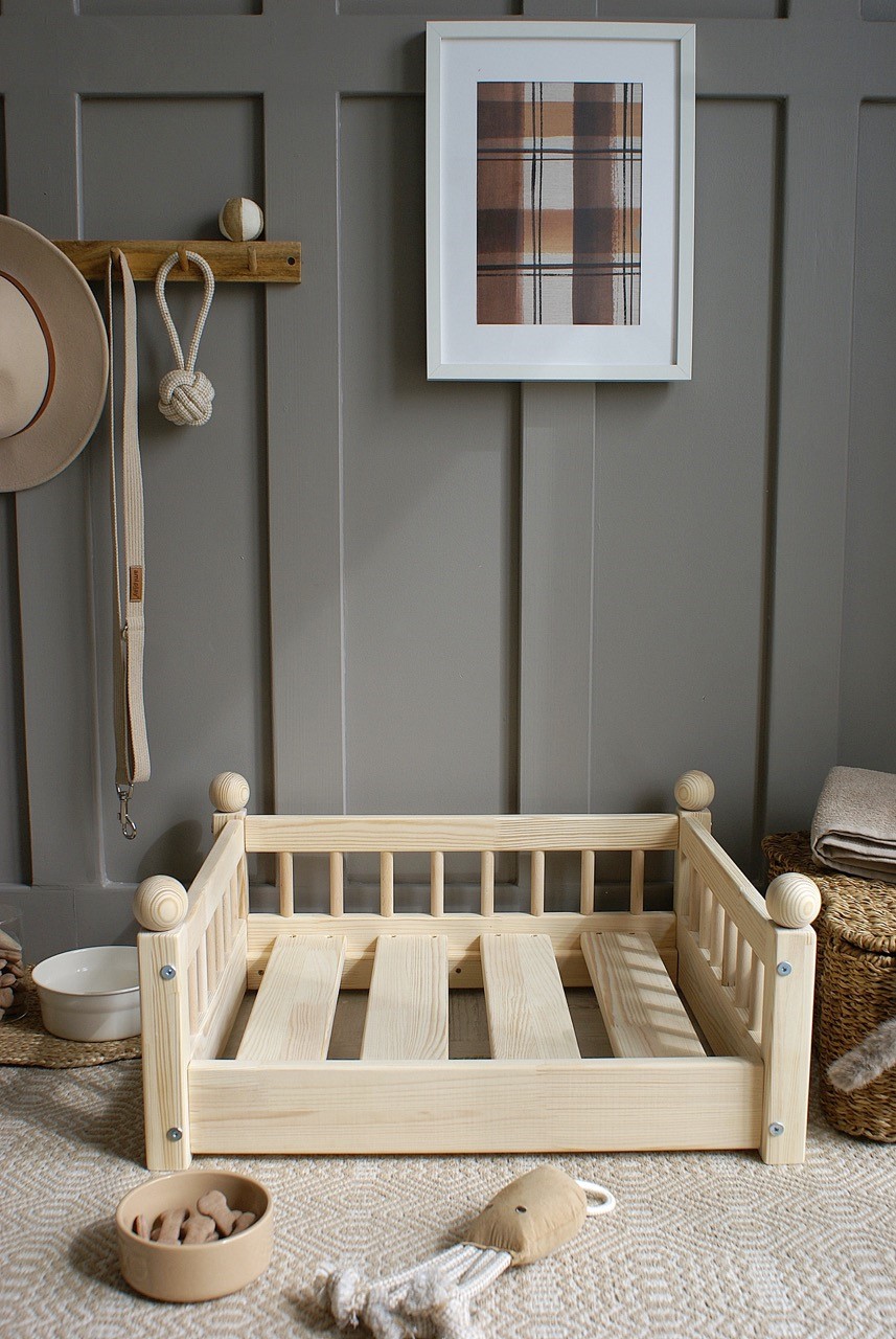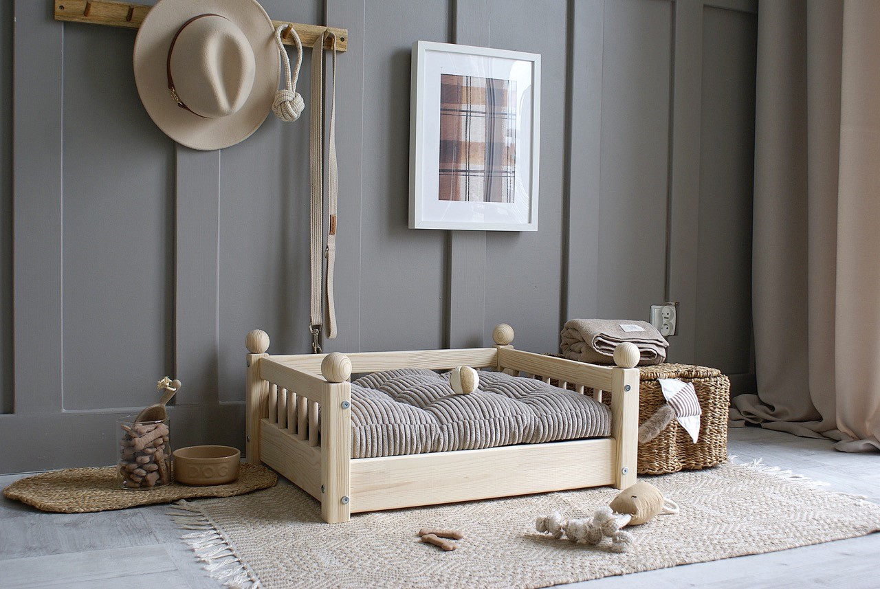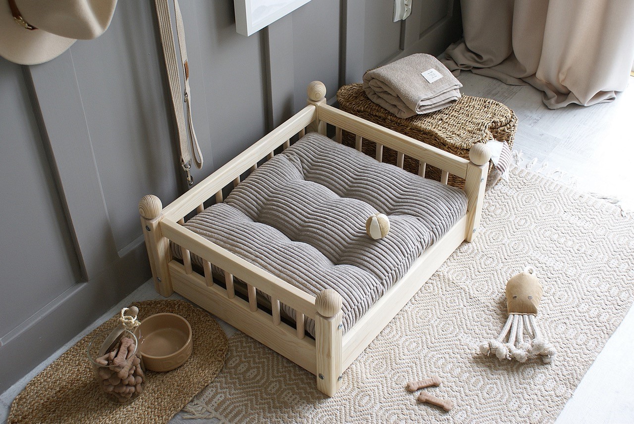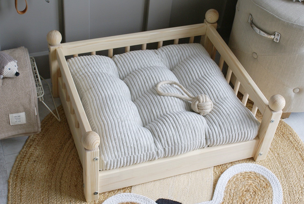 Hundbädd/hundsäng ”Taco” i en naturlig träfinish är den perfekta kombinationen av skandinavisk estetik och funktionalitet.