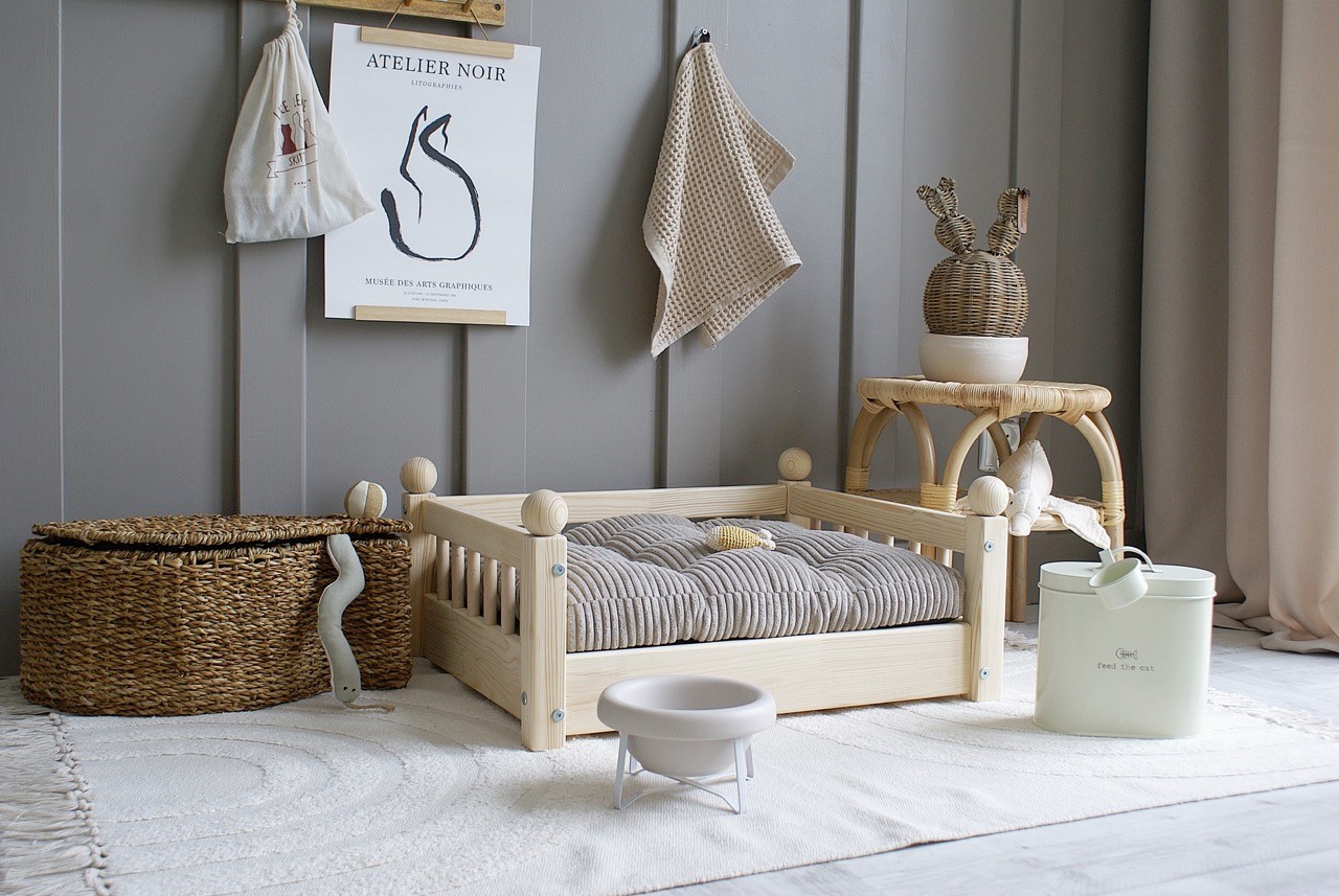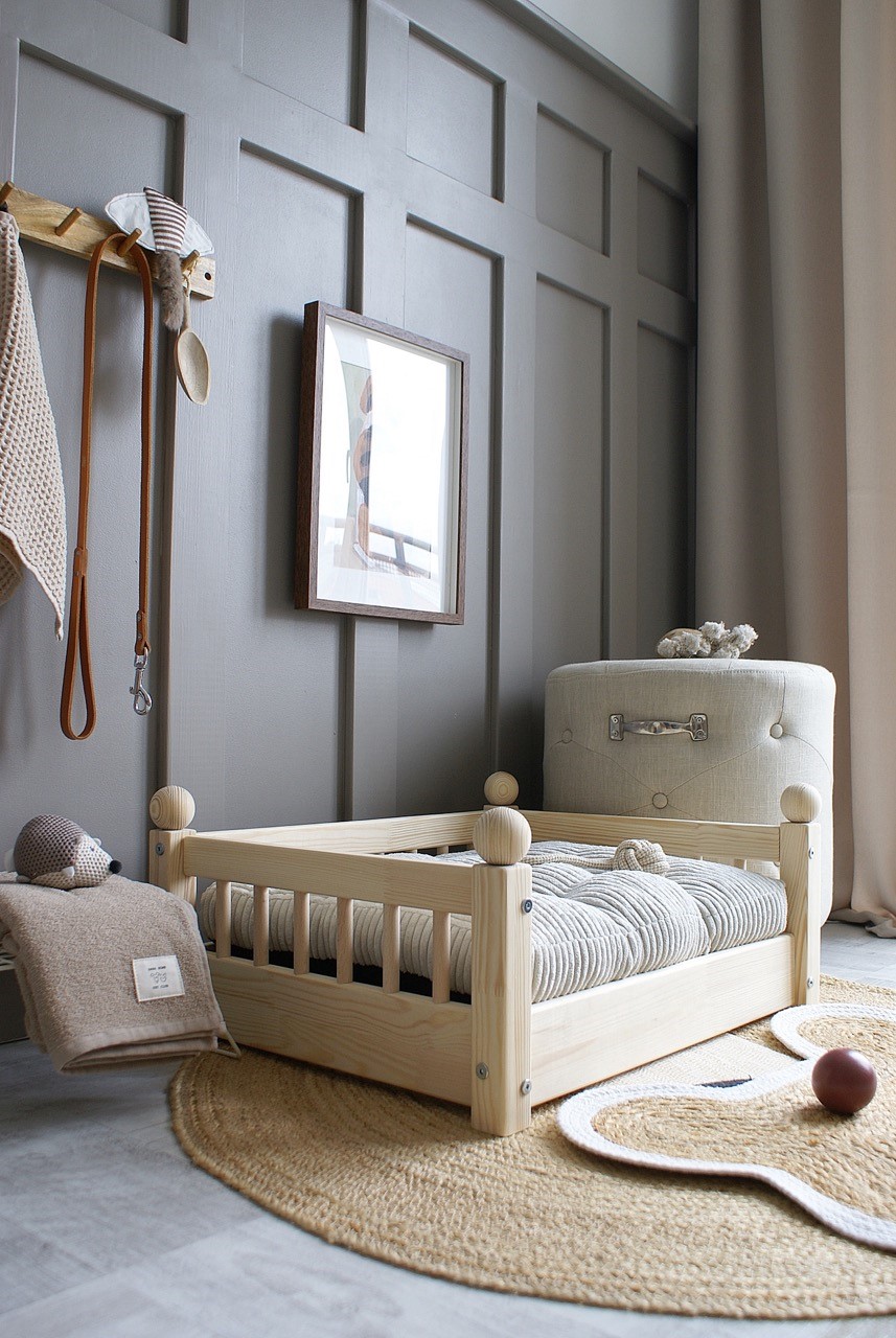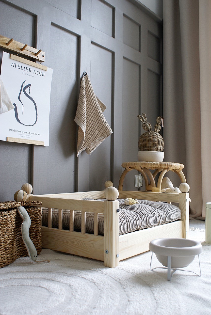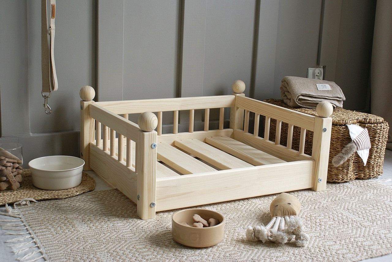 Hundbädd/hundsäng ”Taco” i en naturlig träfinish är den perfekta kombinationen av skandinavisk estetik och funktionalitet.