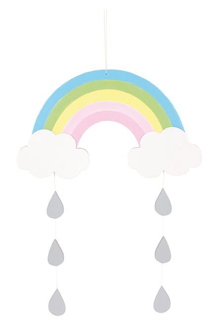 Söt dekorationsmobil i trä i form av en regnbåge med droppar. Häng den ovanför sängen eller skötbordet eller var du vill i barnrummet som en fin dekoration. Passar lika fint i babyrummet som i barnrummet till de lite större barnen som en fin inredningsdetalj.